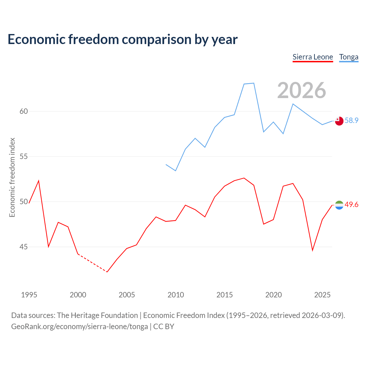 The Economic Freedom Index for Sierra Leone is 49.6, ranking 165/197, compared to 58.9 for Tonga, ranking 107/197. The chart above displays a comparison of annual changes in economic freedom indexes.
