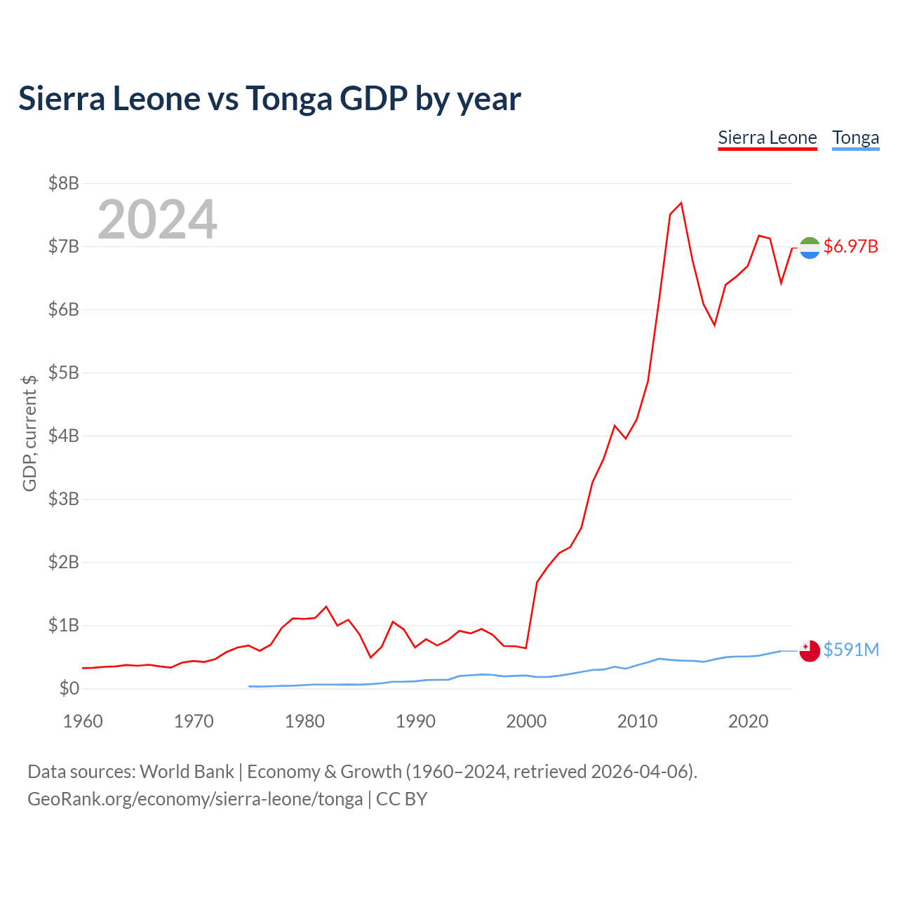 Sierra Leone has a GDP of $6.97B compared to $591M for Tonga, ranking 160/197 and 191/197 by economy size, respectively.