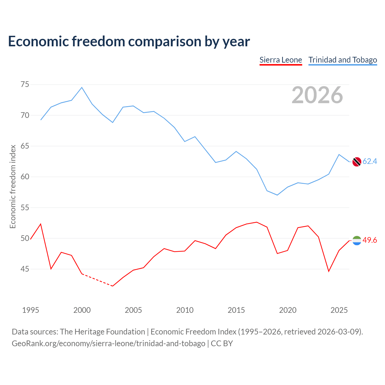 The Economic Freedom Index for Sierra Leone is 49.6, ranking 165/197, compared to 62.4 for Trinidad and Tobago, ranking 87/197. The chart above displays a comparison of annual changes in economic freedom indexes.