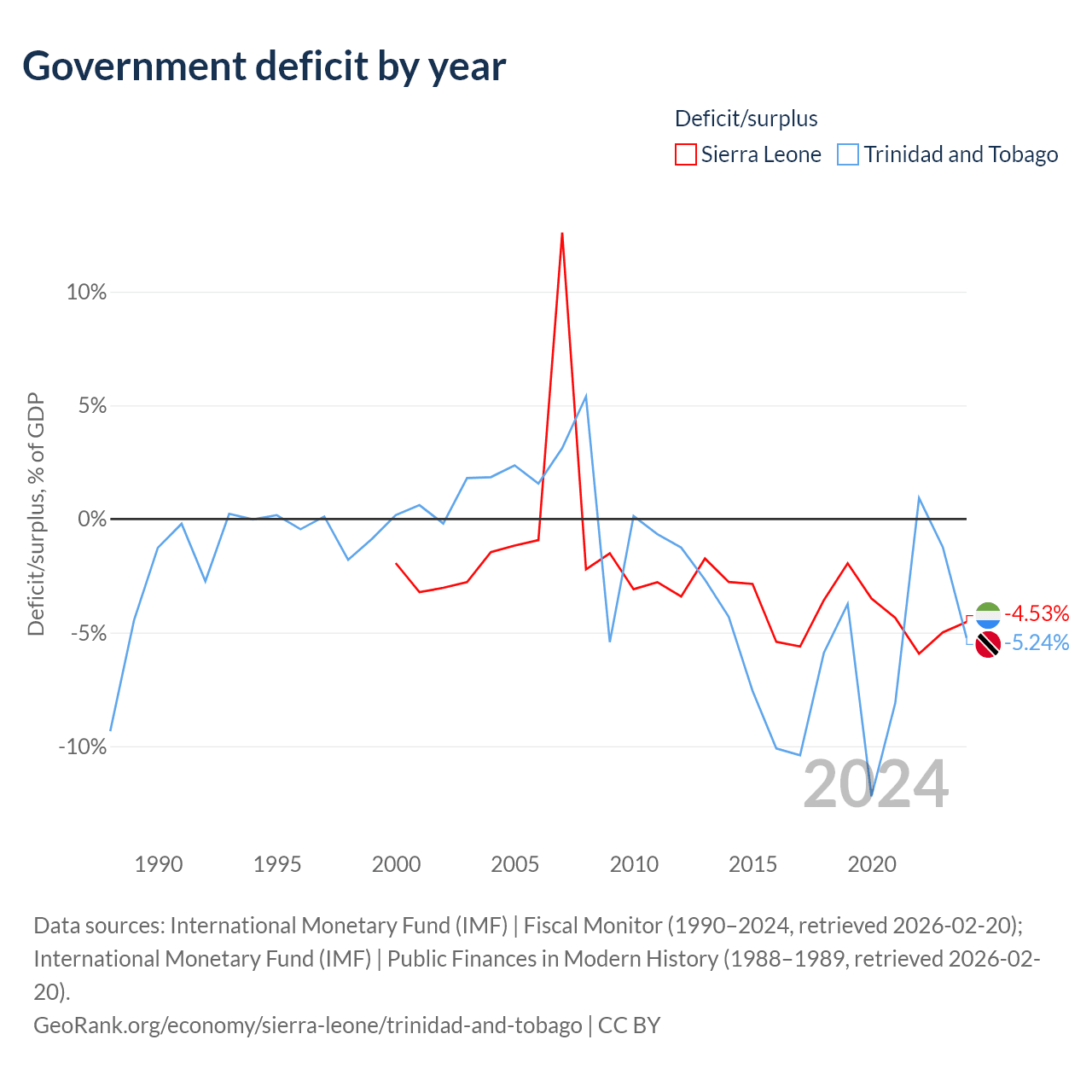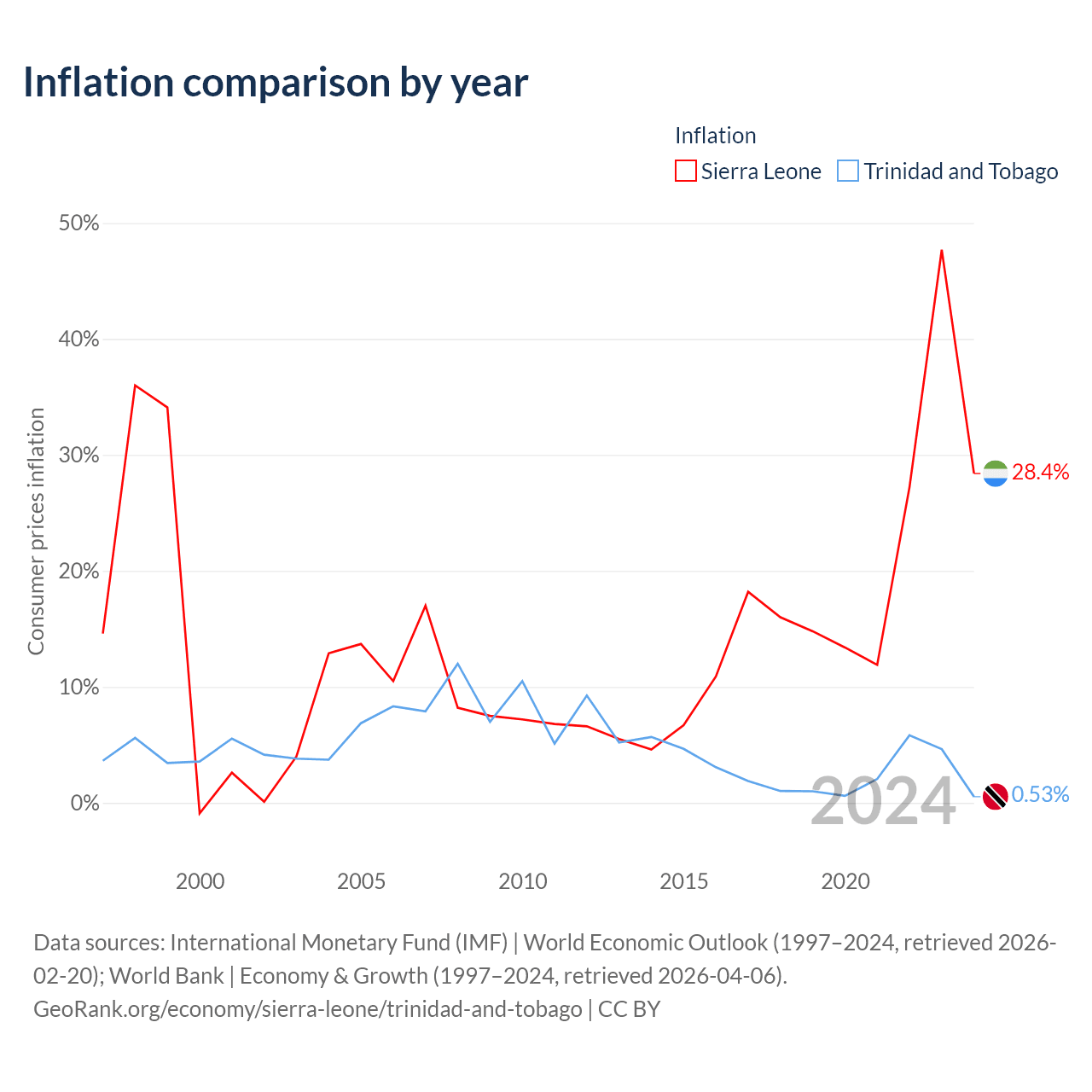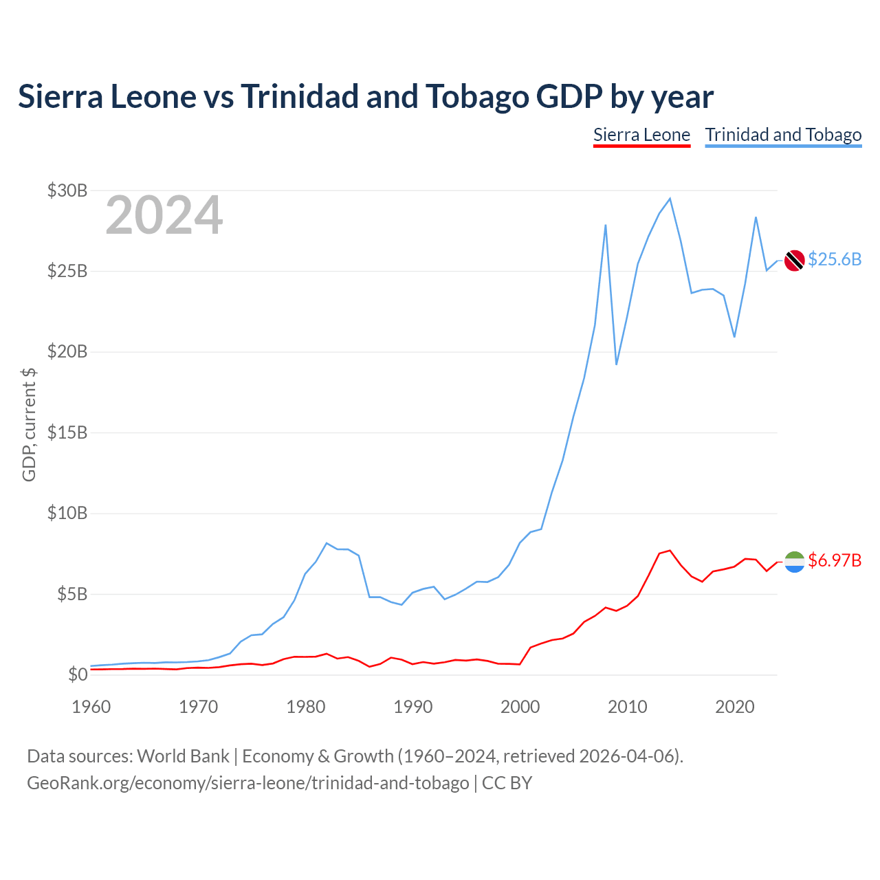 Sierra Leone has a GDP of $6.97B compared to $25.6B for Trinidad and Tobago, ranking 160/197 and 115/197 by economy size, respectively.
