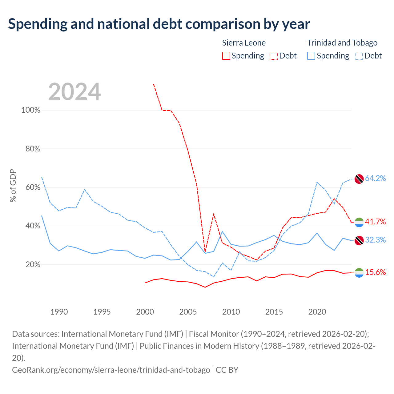 Sierra Leone has $2.91B in government debt (41.7% of GDP), compared to $16.5B (64.2% of GDP) in Trinidad and Tobago.