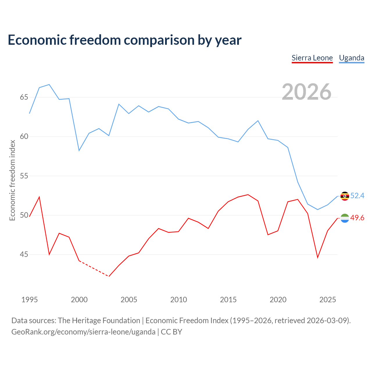 The Economic Freedom Index for Sierra Leone is 49.6, ranking 165/197, compared to 52.4 for Uganda, ranking 149/197. The chart above displays a comparison of annual changes in economic freedom indexes.