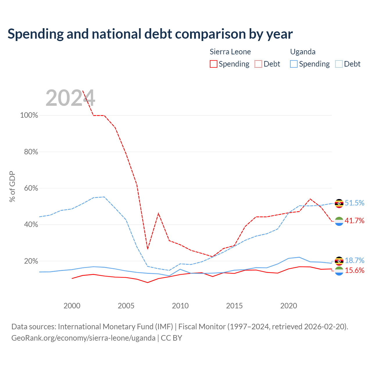 Sierra Leone has $2.91B in government debt (41.7% of GDP), compared to $27.8B (51.5% of GDP) in Uganda.