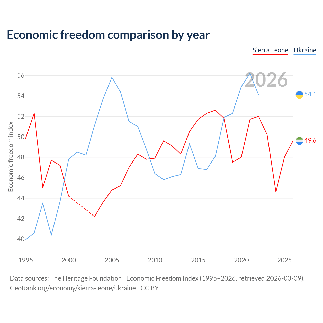 The Economic Freedom Index for Sierra Leone is 49.6, ranking 165/197, compared to 54.1 for Ukraine, ranking 135/197. The chart above displays a comparison of annual changes in economic freedom indexes.