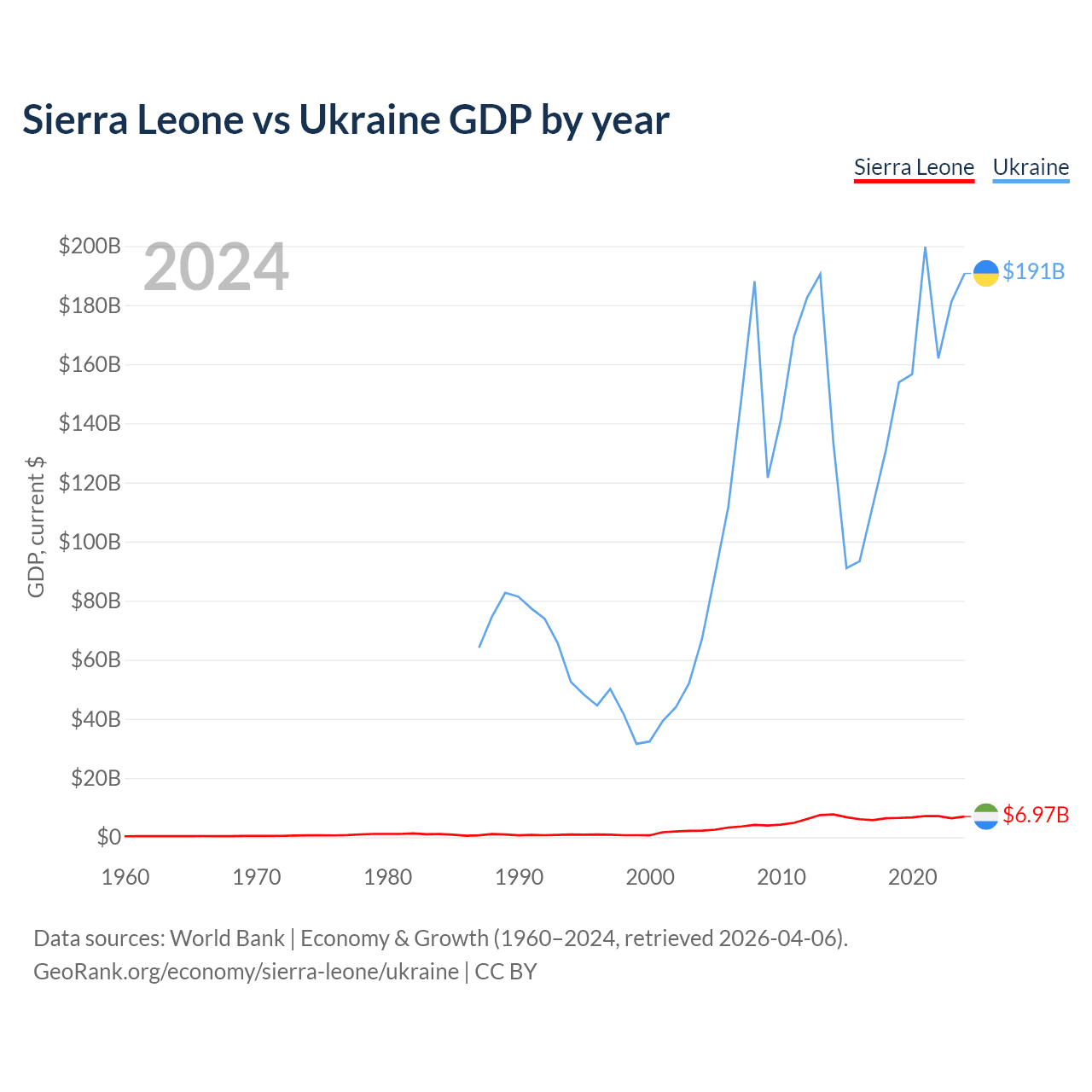 Sierra Leone has a GDP of $6.97B compared to $191B for Ukraine, ranking 160/197 and 57/197 by economy size, respectively.