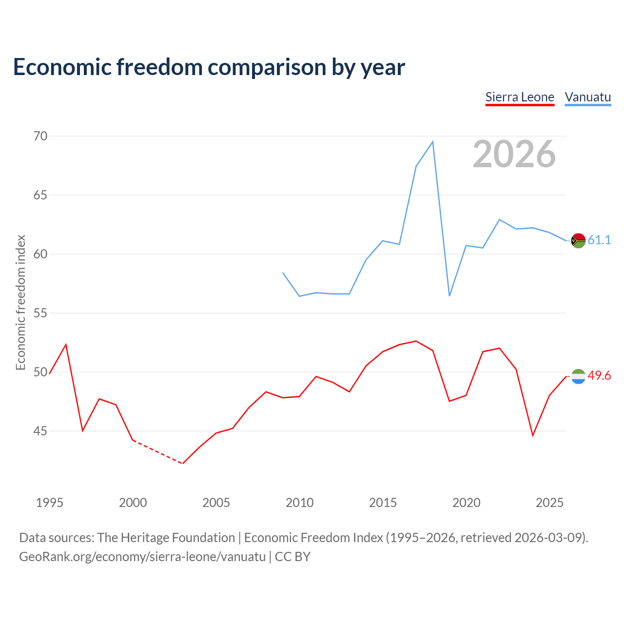 The Economic Freedom Index for Sierra Leone is 49.6, ranking 165/197, compared to 61.1 for Vanuatu, ranking 92/197. The chart above displays a comparison of annual changes in economic freedom indexes.