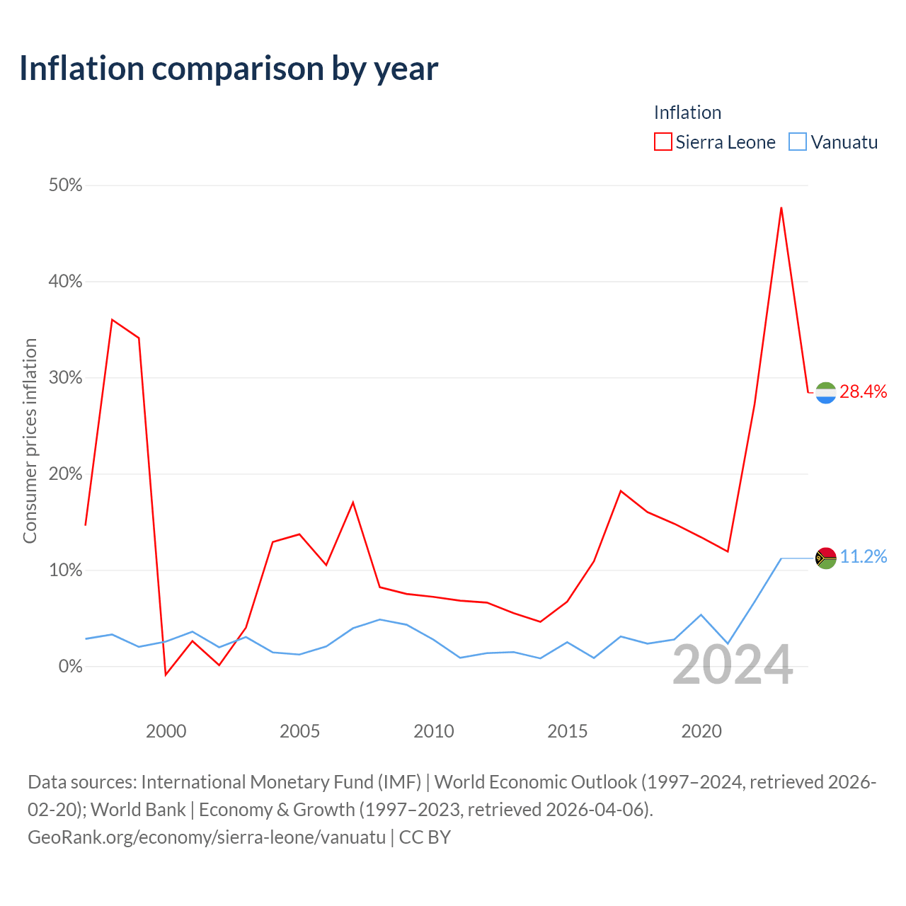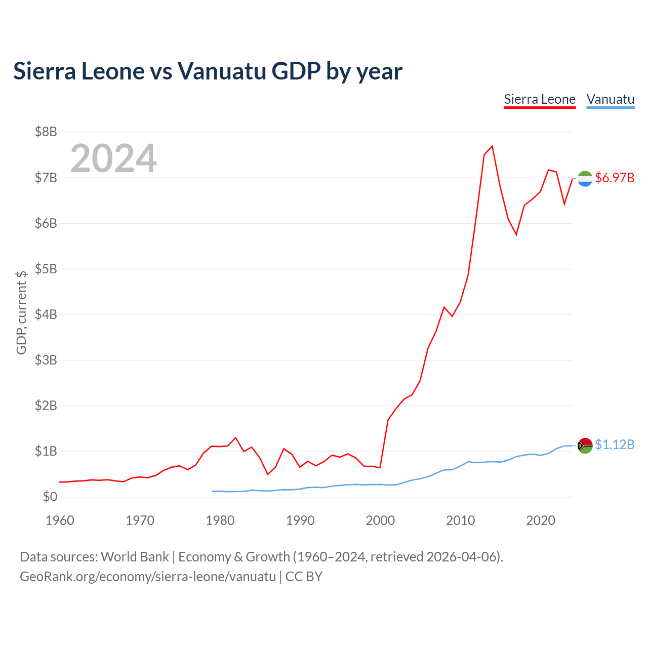 Sierra Leone has a GDP of $6.97B compared to $1.12B for Vanuatu, ranking 160/197 and 188/197 by economy size, respectively.