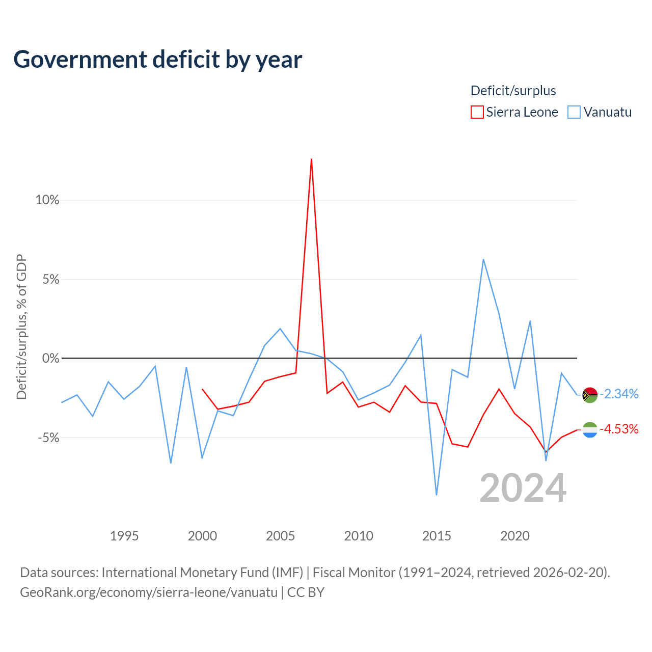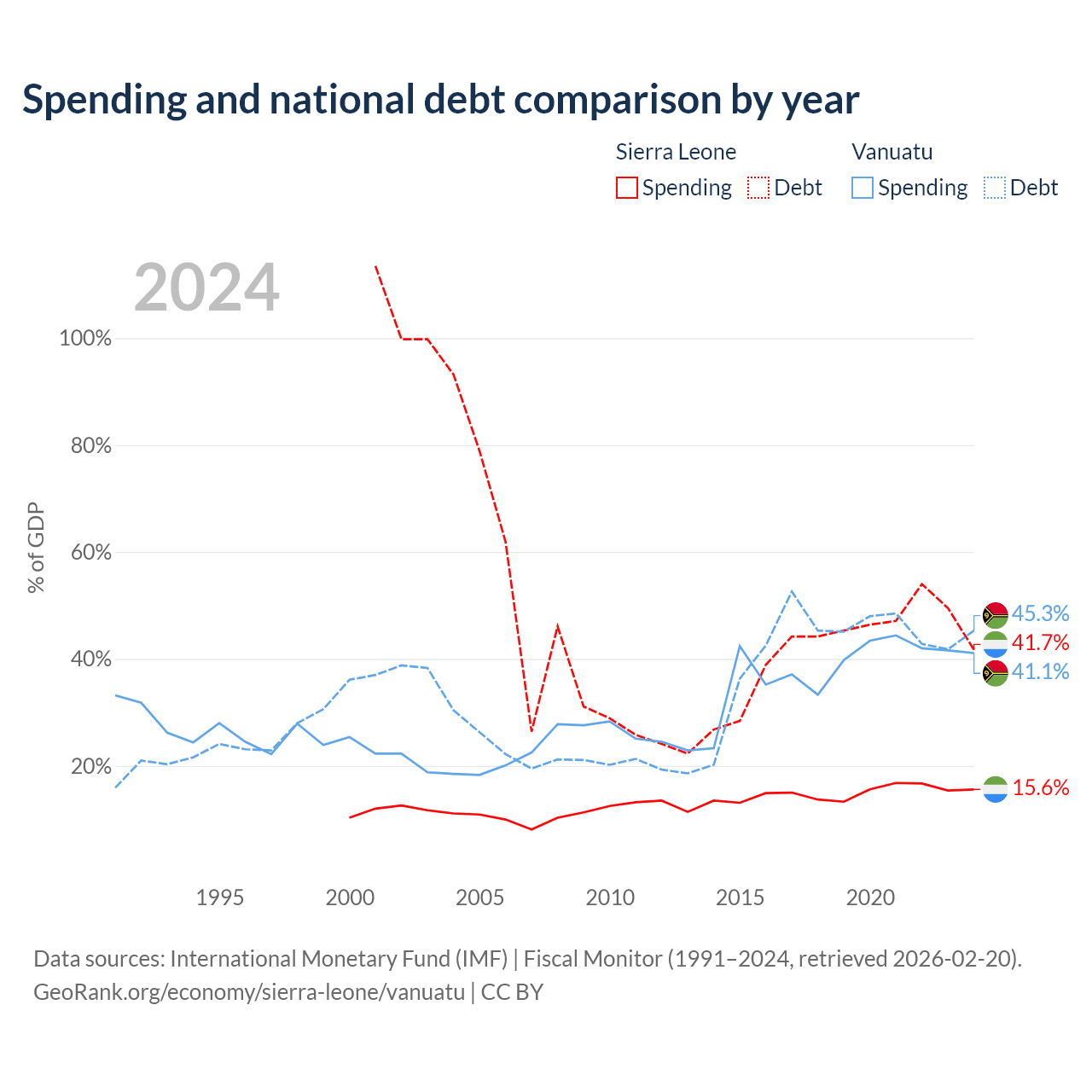 Sierra Leone has $2.91B in government debt (41.7% of GDP), compared to $507M (45.3% of GDP) in Vanuatu.