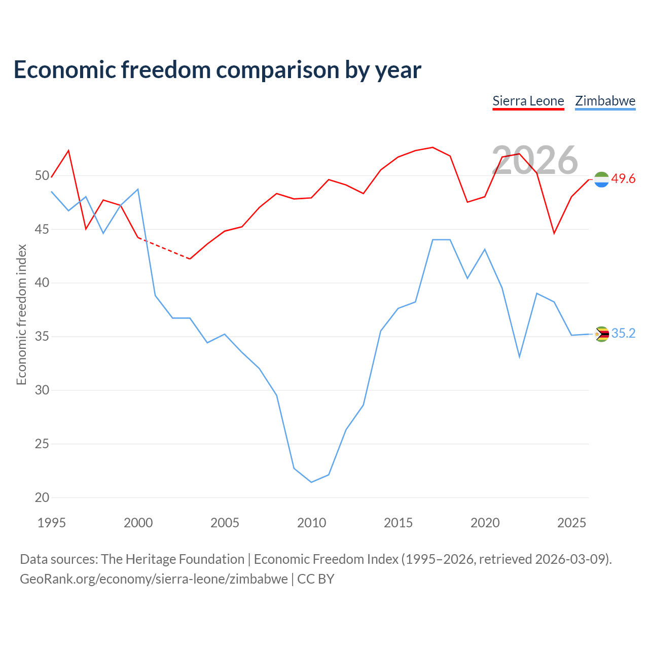 The Economic Freedom Index for Sierra Leone is 49.6, ranking 165/197, compared to 35.2 for Zimbabwe, ranking 190/197. The chart above displays a comparison of annual changes in economic freedom indexes.