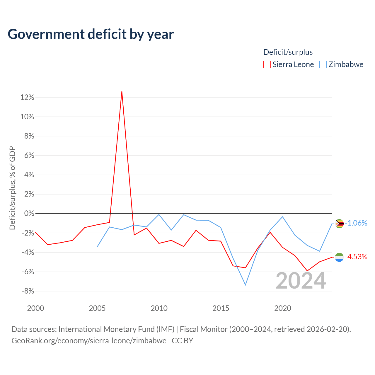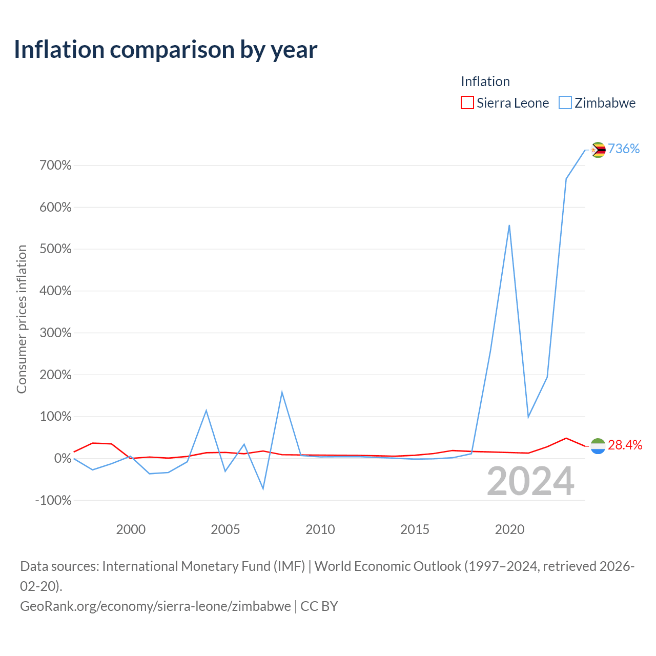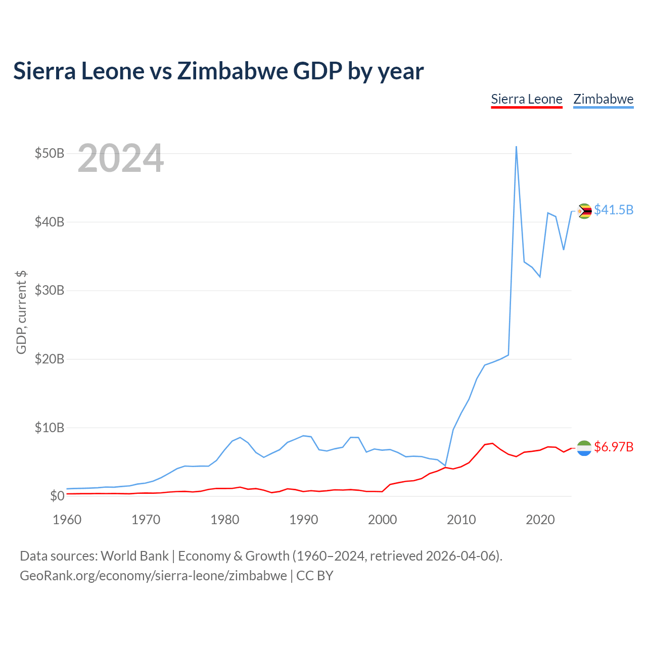 Sierra Leone has a GDP of $6.97B compared to $41.5B for Zimbabwe, ranking 160/197 and 102/197 by economy size, respectively.