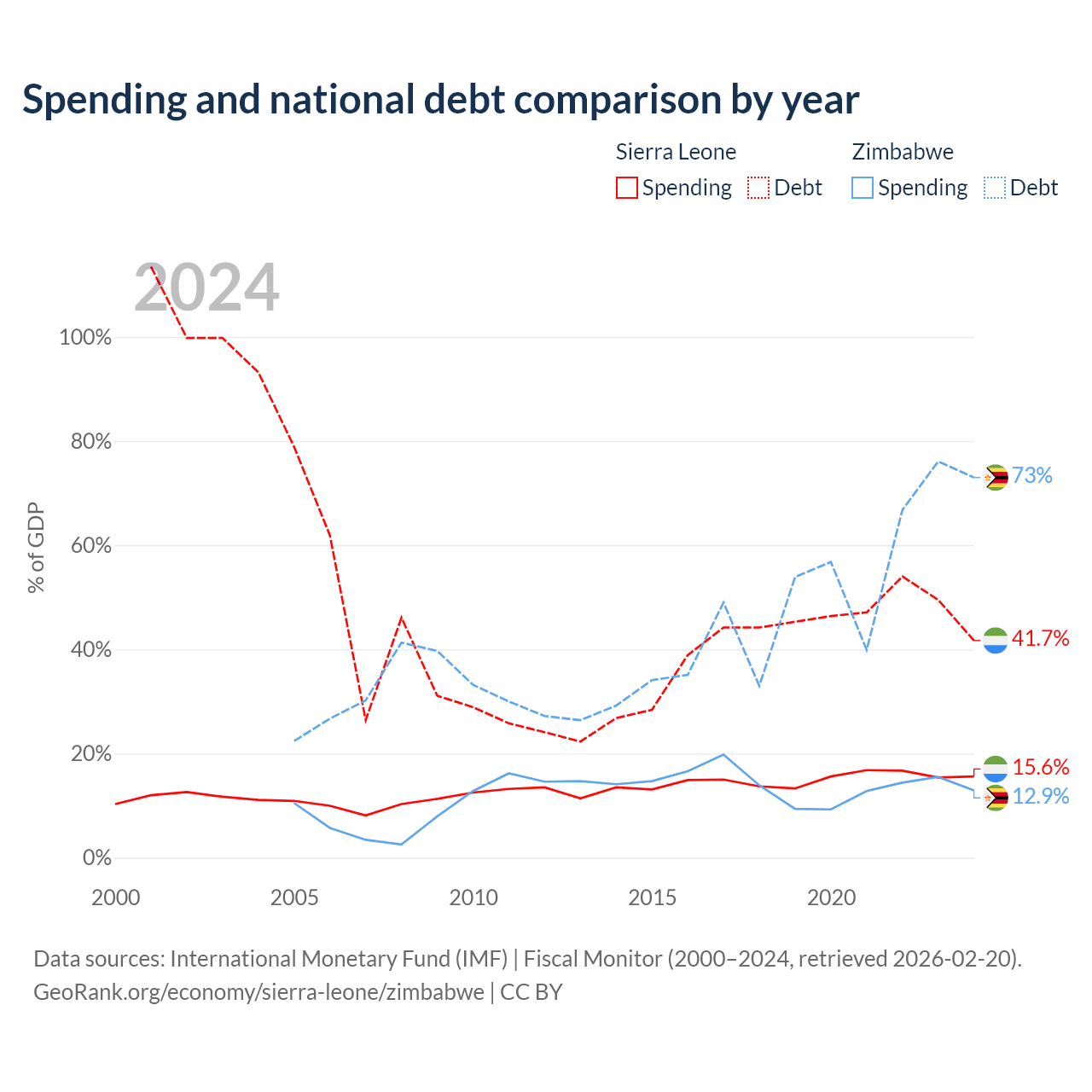 Sierra Leone has $2.91B in government debt (41.7% of GDP), compared to $30.3B (73% of GDP) in Zimbabwe.