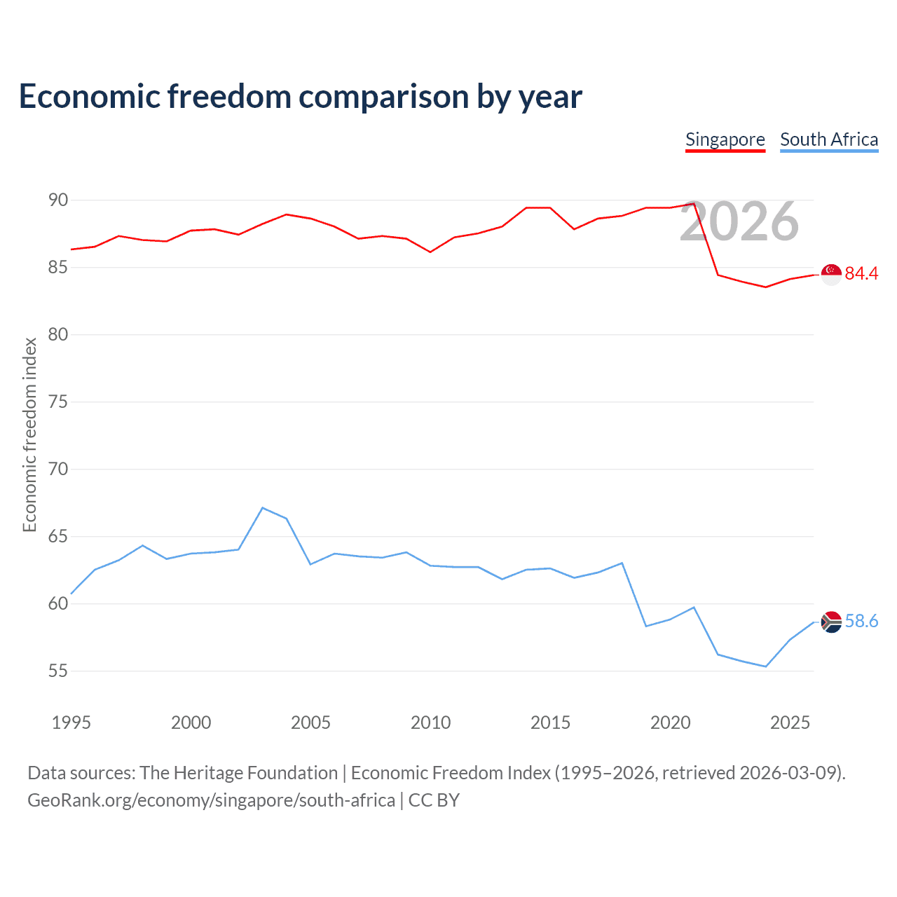 The Economic Freedom Index for Singapore is 84.4, ranking 1/197, compared to 58.6 for South Africa, ranking 110/197. The chart above displays a comparison of annual changes in economic freedom indexes.