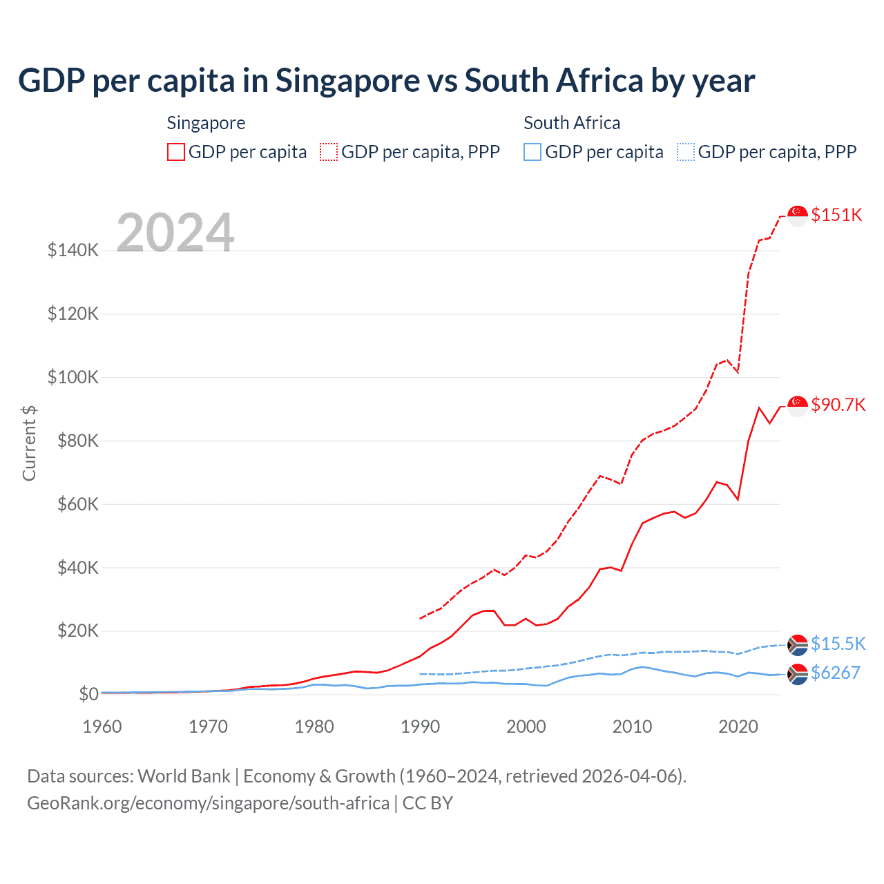 GDP per capita in Singapore vs South Africa by year