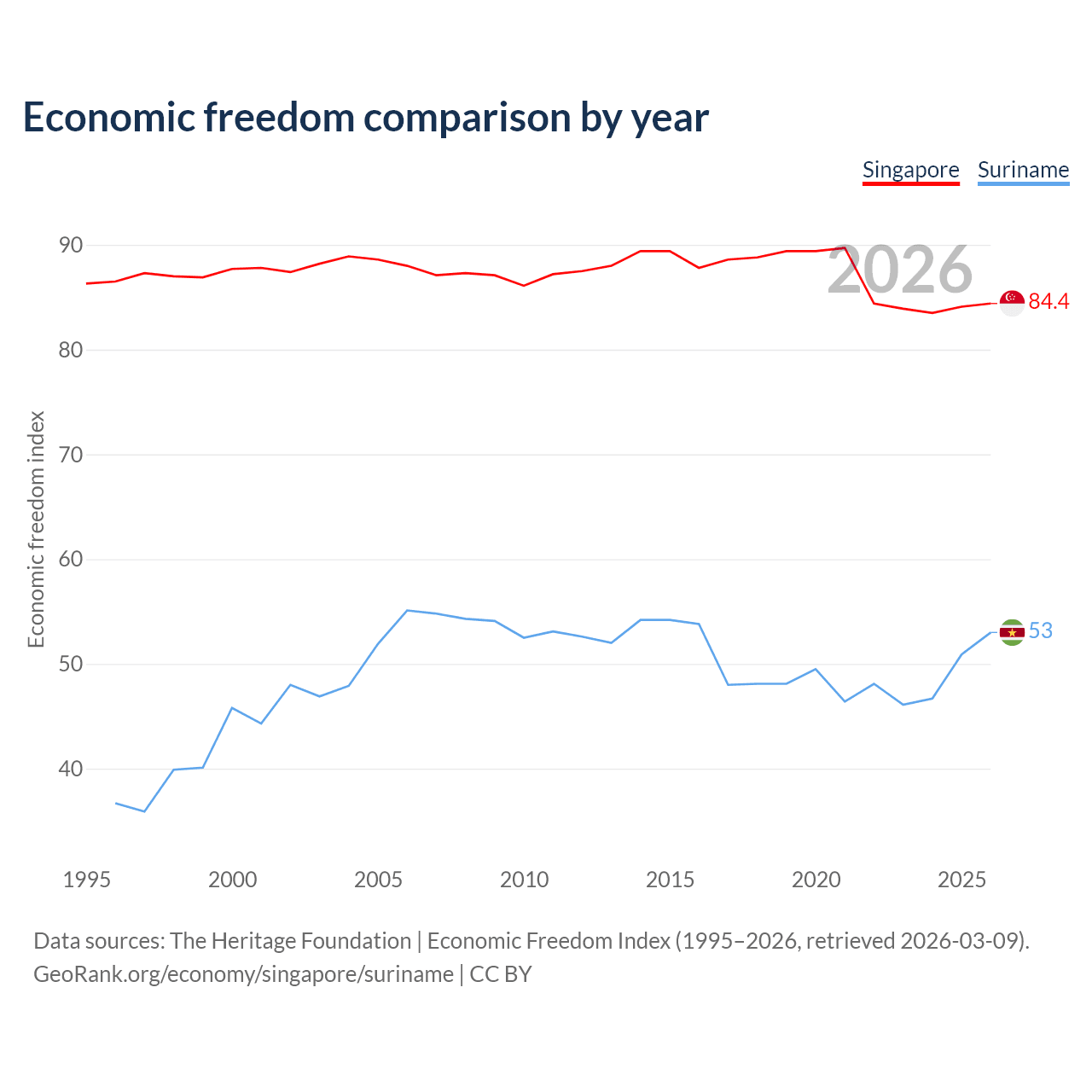 The Economic Freedom Index for Singapore is 84.4, ranking 1/197, compared to 53 for Suriname, ranking 143/197. The chart above displays a comparison of annual changes in economic freedom indexes.
