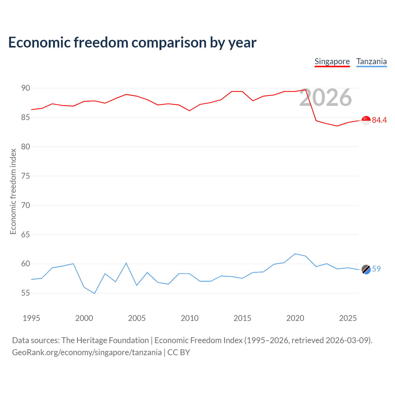 The Economic Freedom Index for Singapore is 84.4, ranking 1/197, compared to 59 for Tanzania, ranking 106/197. The chart above displays a comparison of annual changes in economic freedom indexes.
