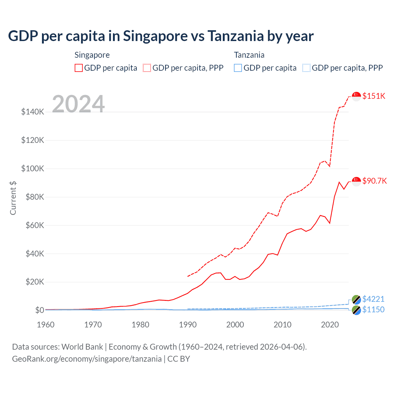 Singapore has a GDP of $547B compared to $78.8B for Tanzania, ranking 28/197 and 82/197 by economy size, respectively.