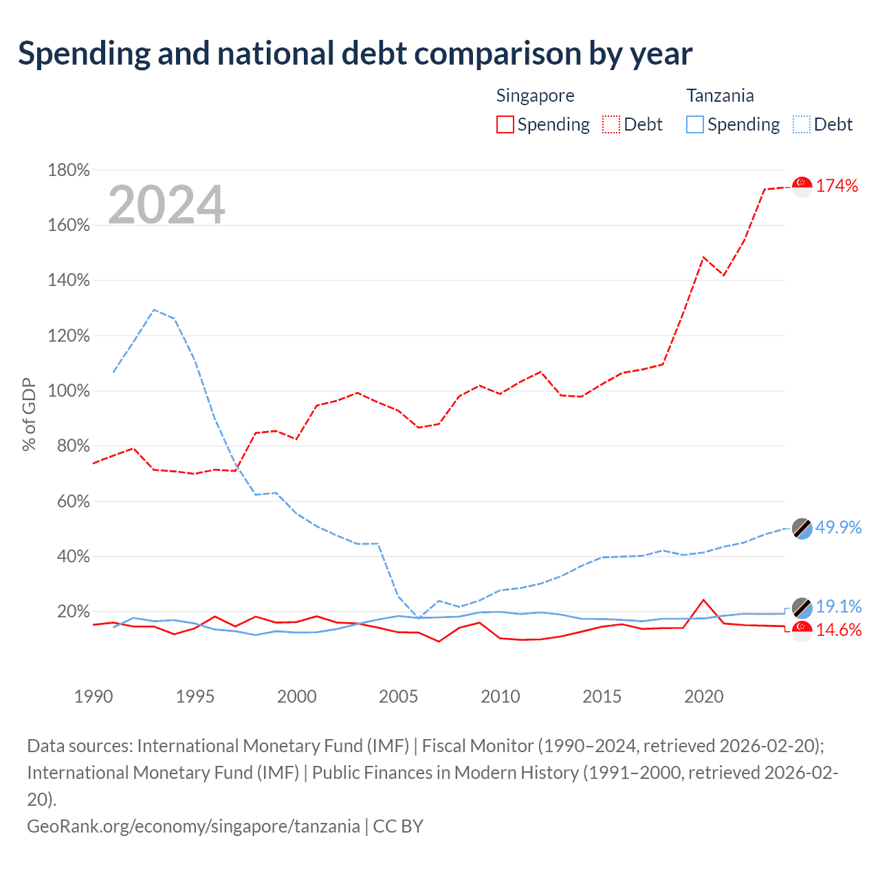 Singapore has $950B in government debt (173.5% of GDP), compared to $39.3B (49.9% of GDP) in Tanzania.
