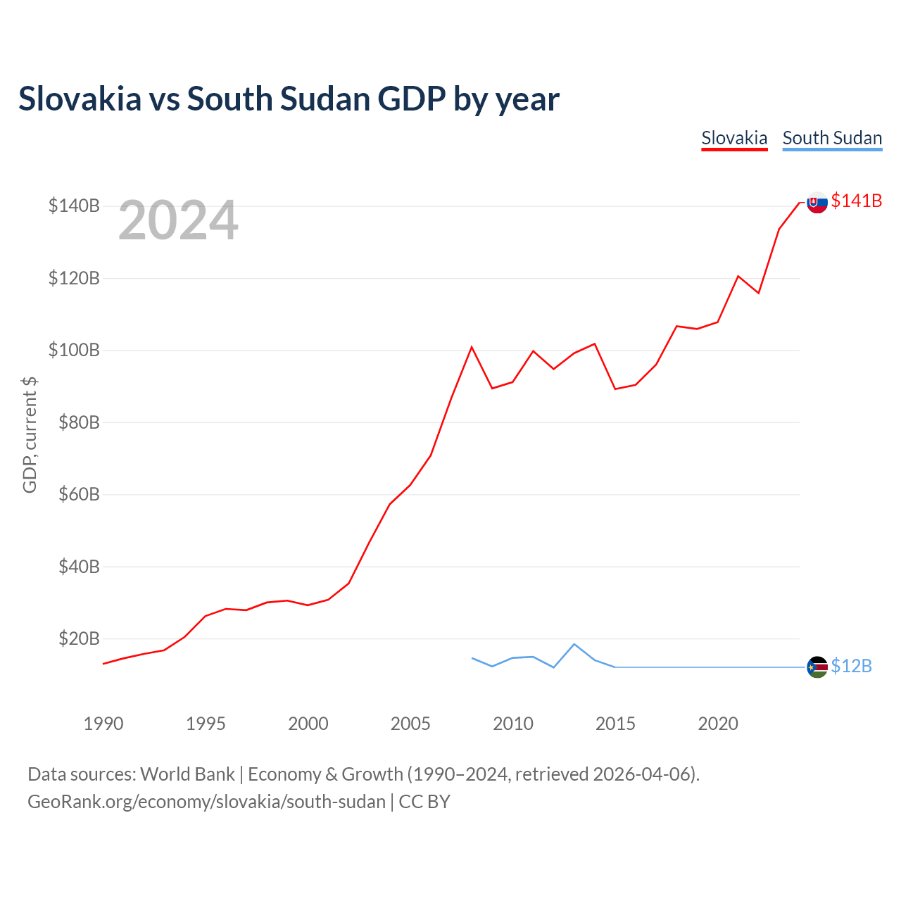 Slovakia has a GDP of $141B compared to $12B for South Sudan, ranking 61/197 and 149/197 by economy size, respectively.