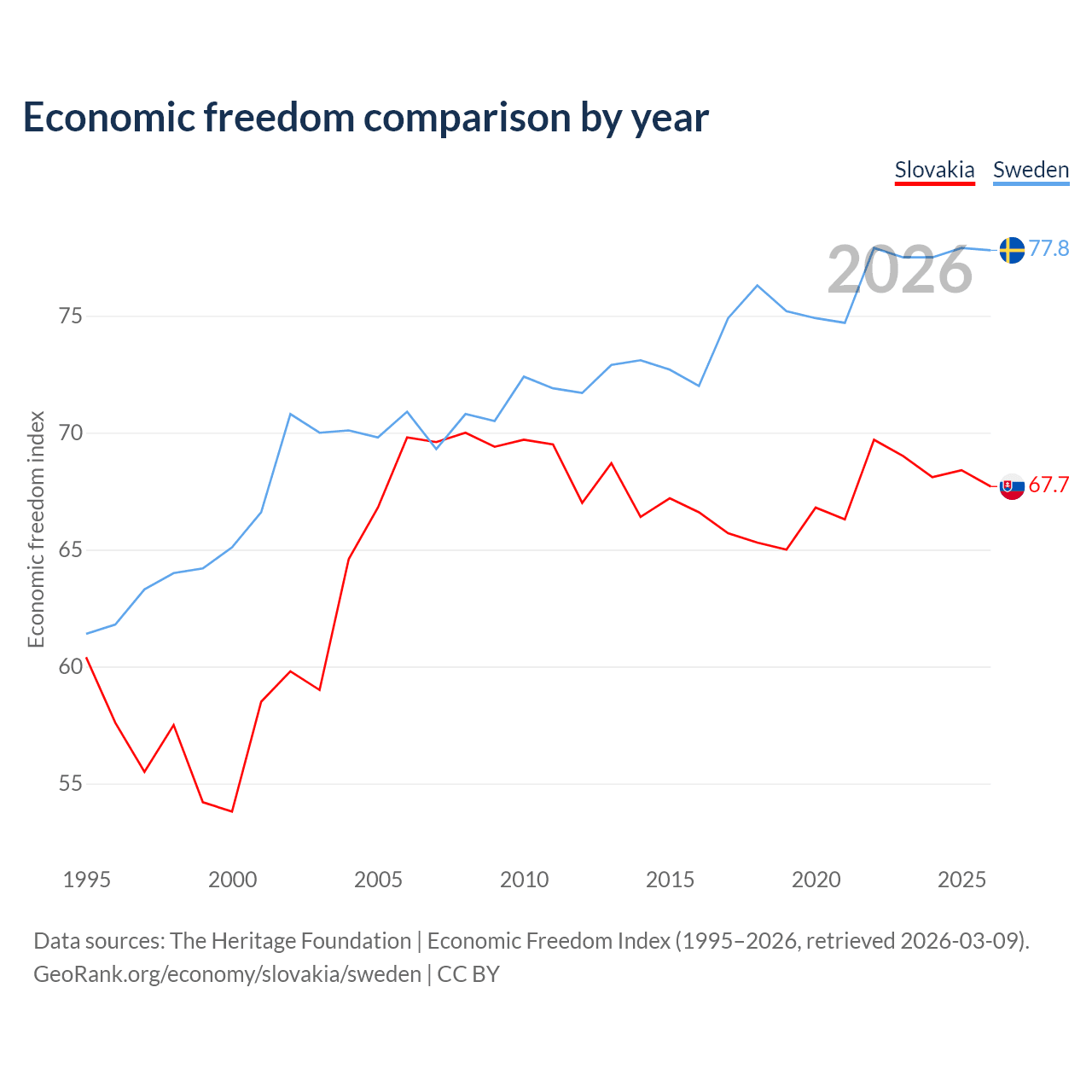 The Economic Freedom Index for Slovakia is 67.7, ranking 54/197, compared to 77.8 for Sweden, ranking 14/197. The chart above displays a comparison of annual changes in economic freedom indexes.