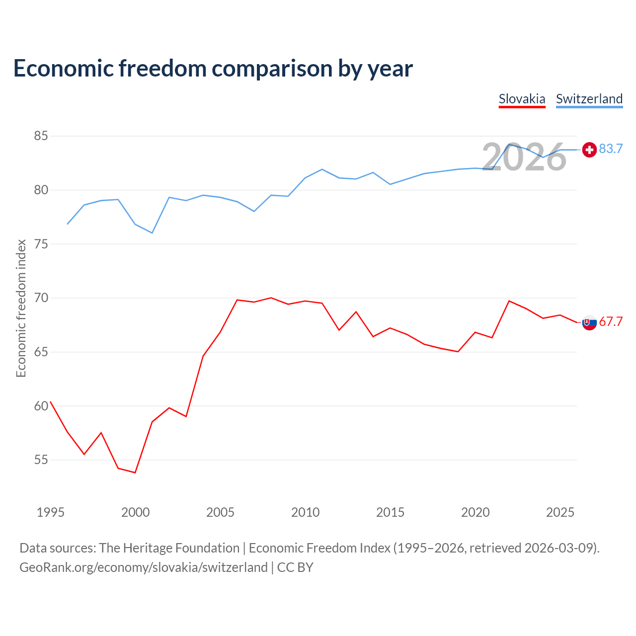 The Economic Freedom Index for Slovakia is 67.7, ranking 54/197, compared to 83.7 for Switzerland, ranking 2/197. The chart above displays a comparison of annual changes in economic freedom indexes.