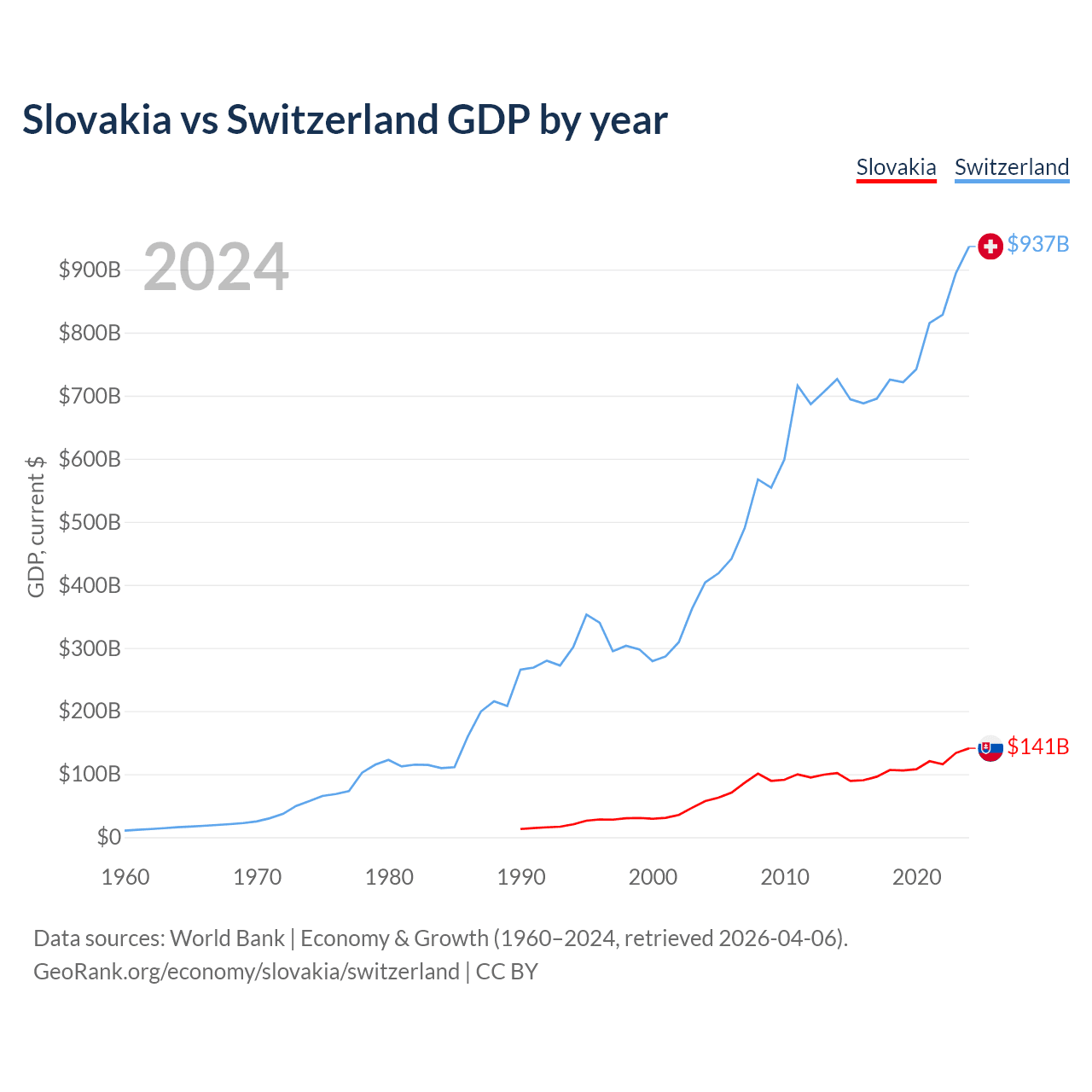 Slovakia has a GDP of $141B compared to $937B for Switzerland, ranking 61/197 and 20/197 by economy size, respectively.