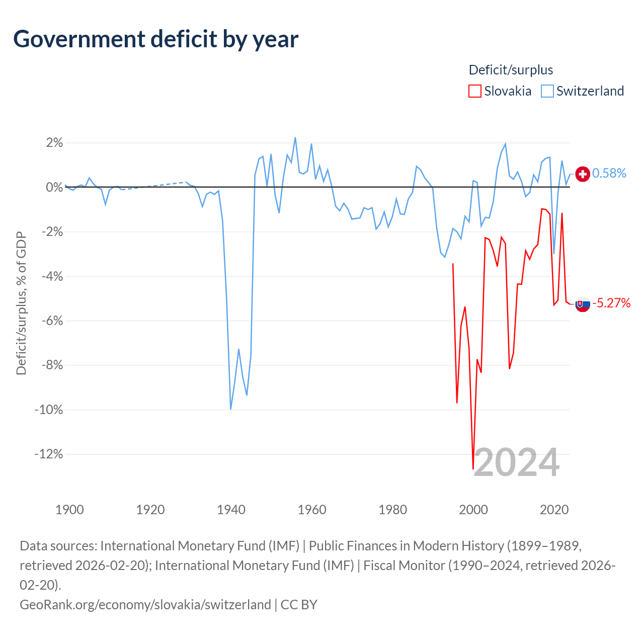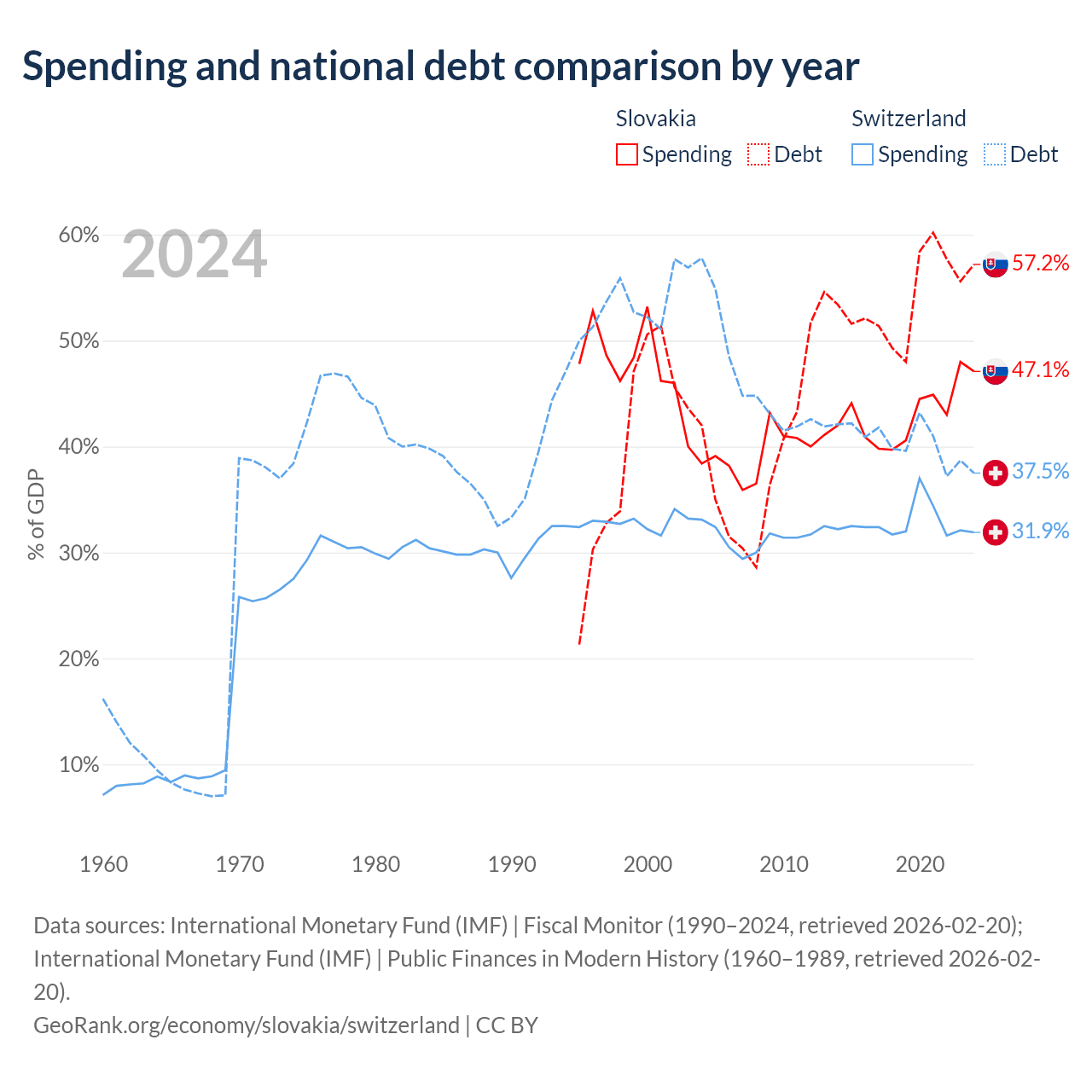 Slovakia has $80.7B in government debt (57.2% of GDP), compared to $351B (37.5% of GDP) in Switzerland.