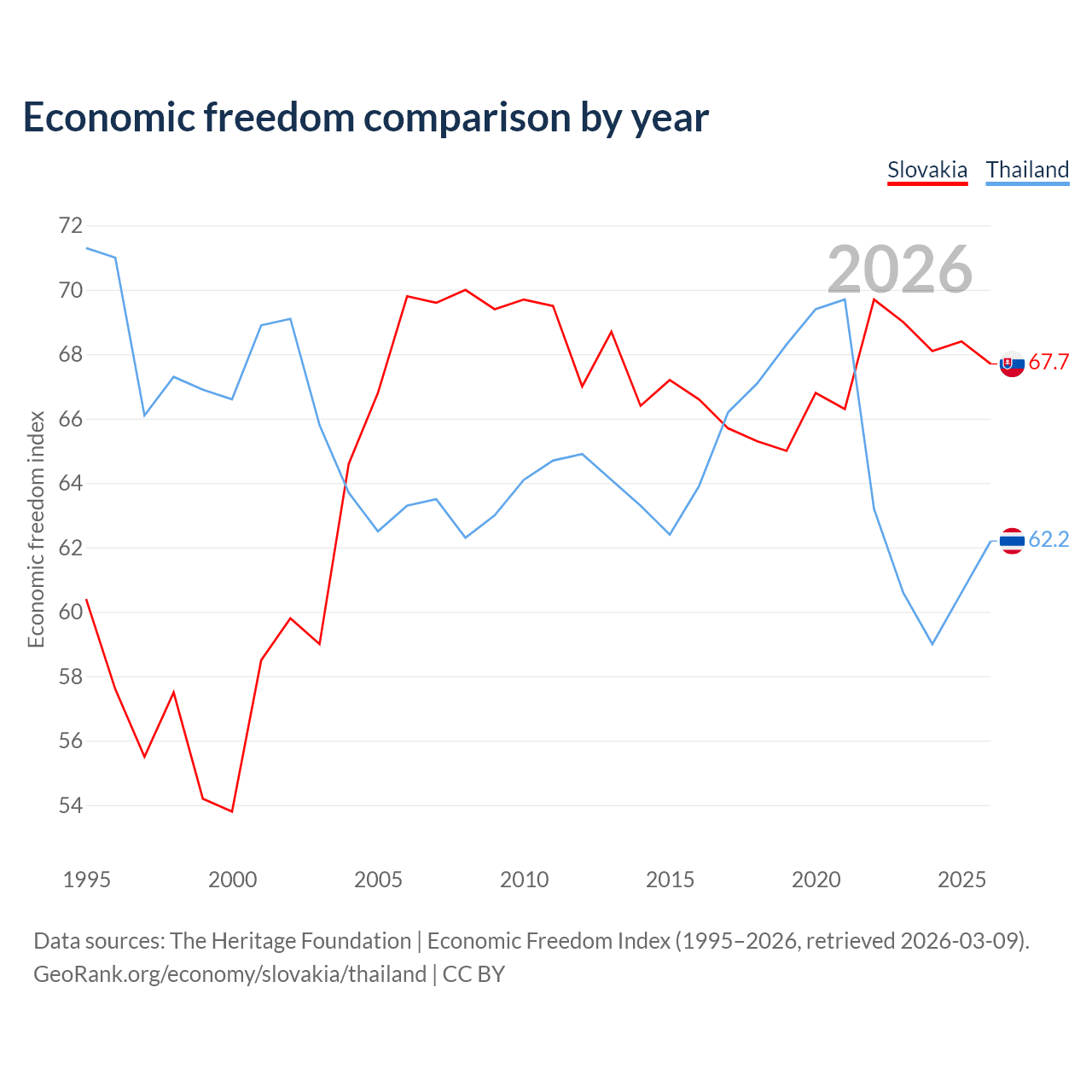 The Economic Freedom Index for Slovakia is 67.7, ranking 54/197, compared to 62.2 for Thailand, ranking 88/197. The chart above displays a comparison of annual changes in economic freedom indexes.