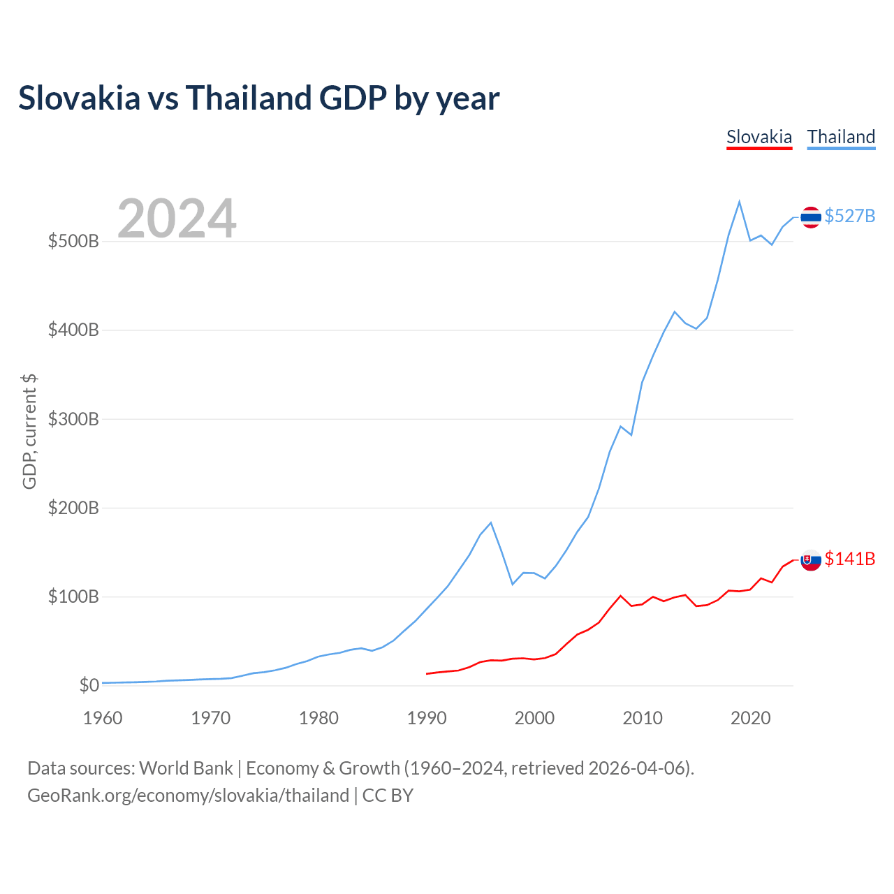 Slovakia has a GDP of $141B compared to $527B for Thailand, ranking 61/197 and 31/197 by economy size, respectively.