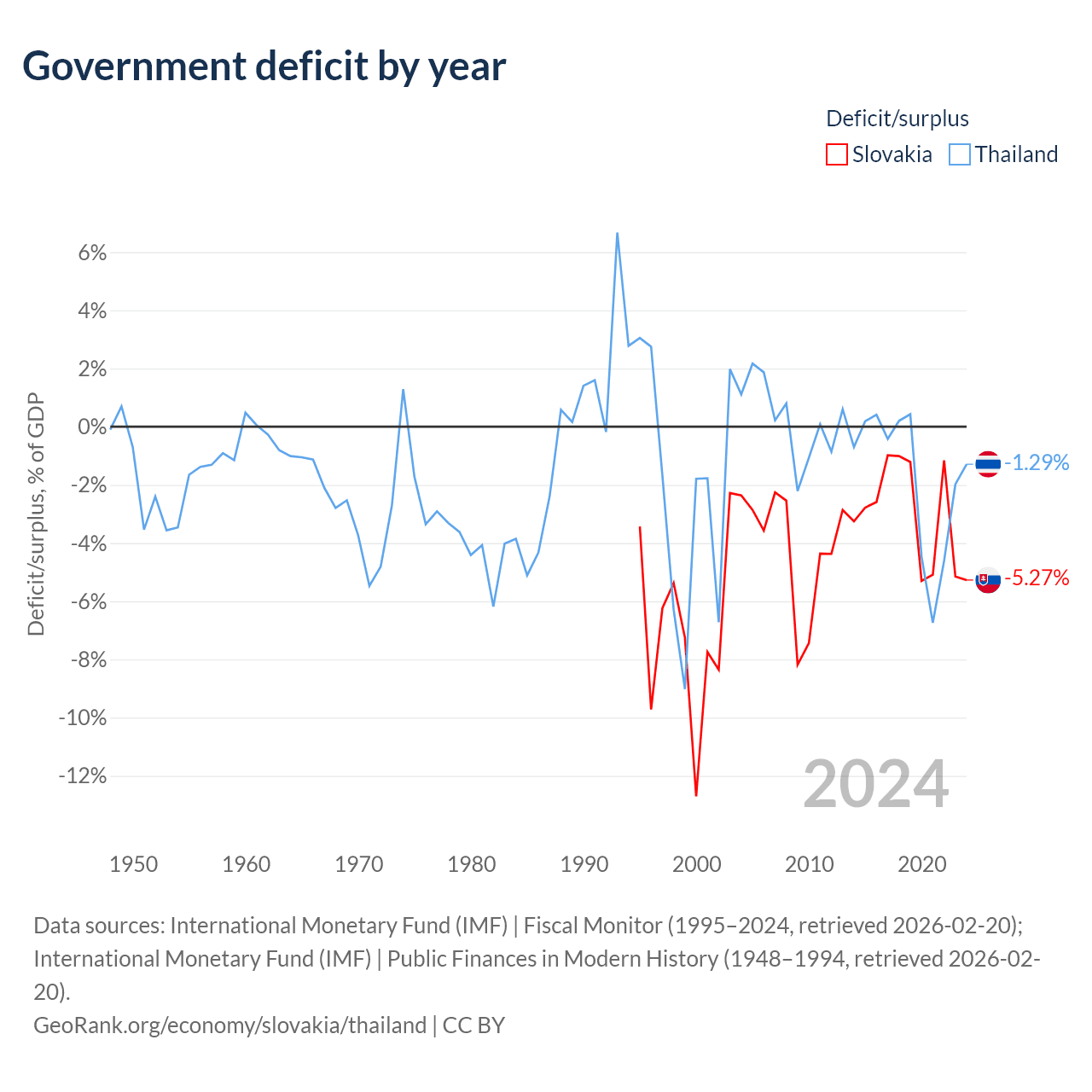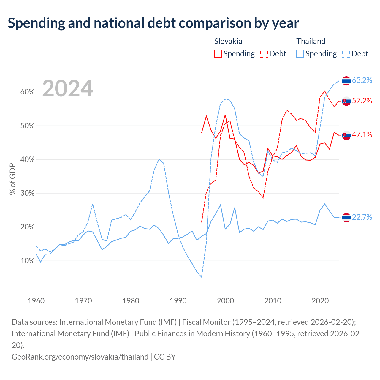Slovakia has $80.7B in government debt (57.2% of GDP), compared to $333B (63.2% of GDP) in Thailand.