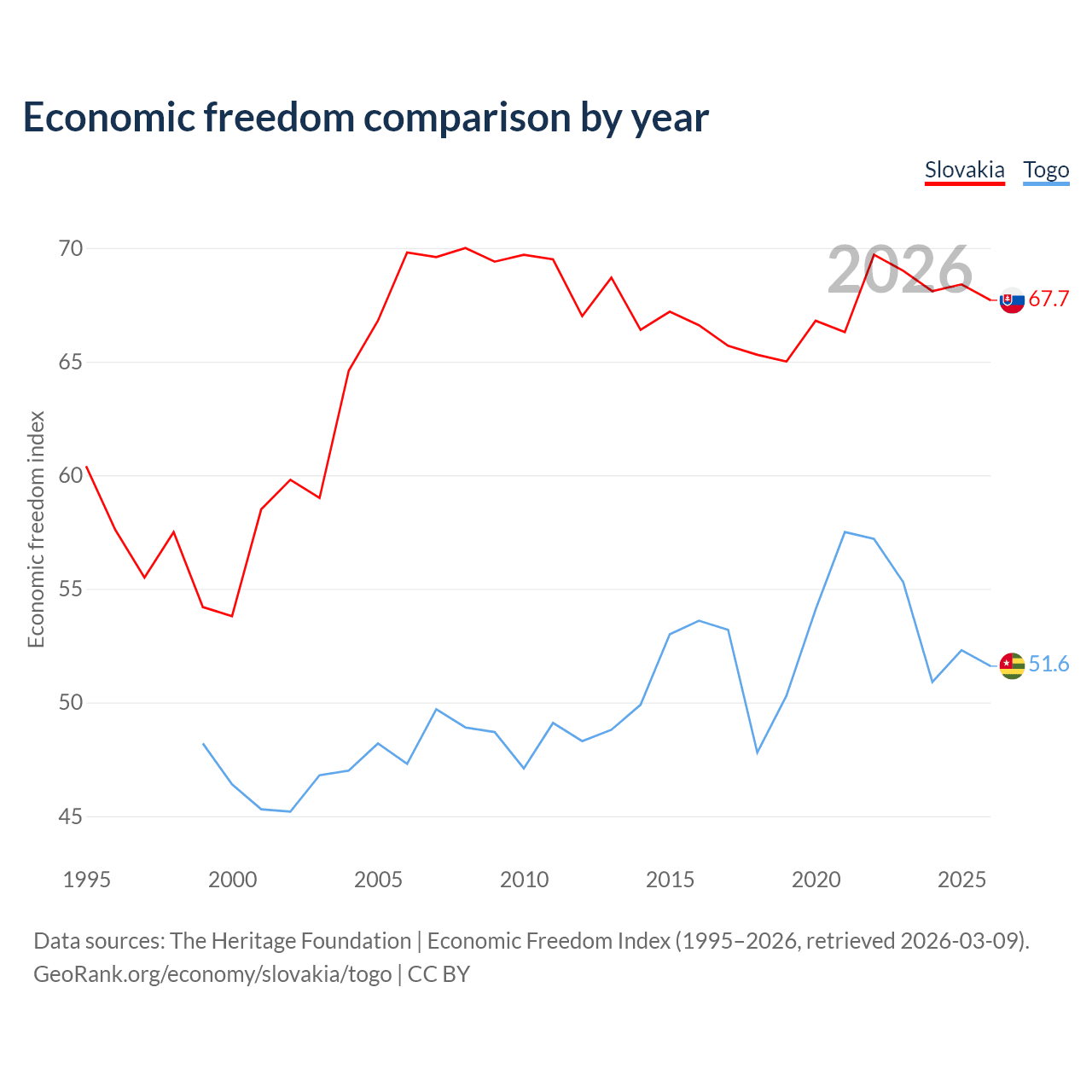 The Economic Freedom Index for Slovakia is 67.7, ranking 54/197, compared to 51.6 for Togo, ranking 153/197. The chart above displays a comparison of annual changes in economic freedom indexes.