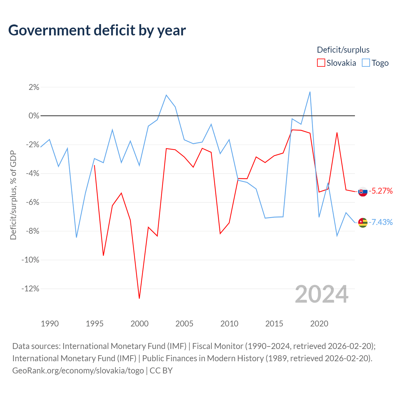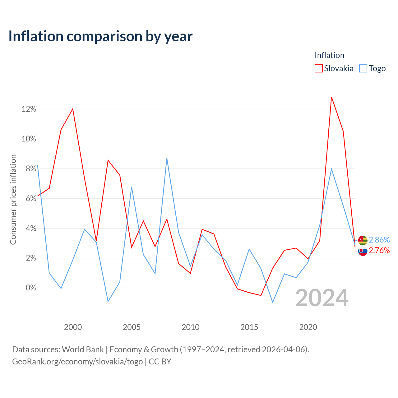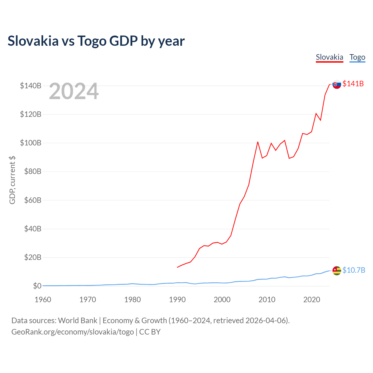 Slovakia has a GDP of $141B compared to $10.7B for Togo, ranking 61/197 and 154/197 by economy size, respectively.