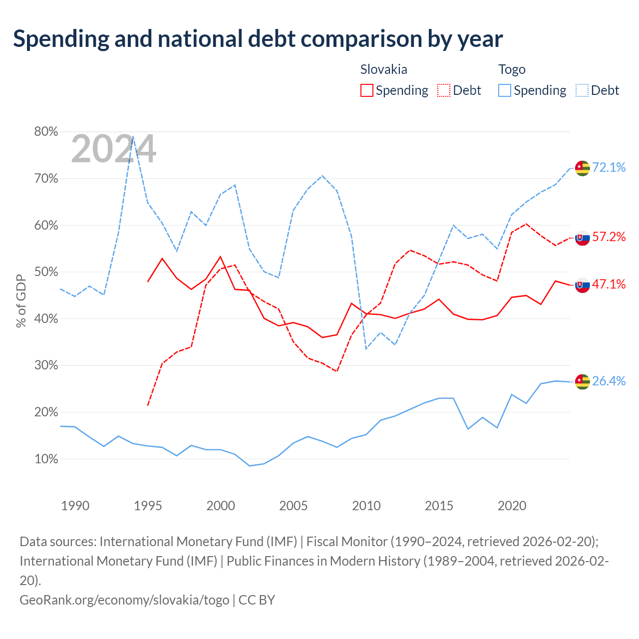 Slovakia has $80.7B in government debt (57.2% of GDP), compared to $7.68B (72.1% of GDP) in Togo.