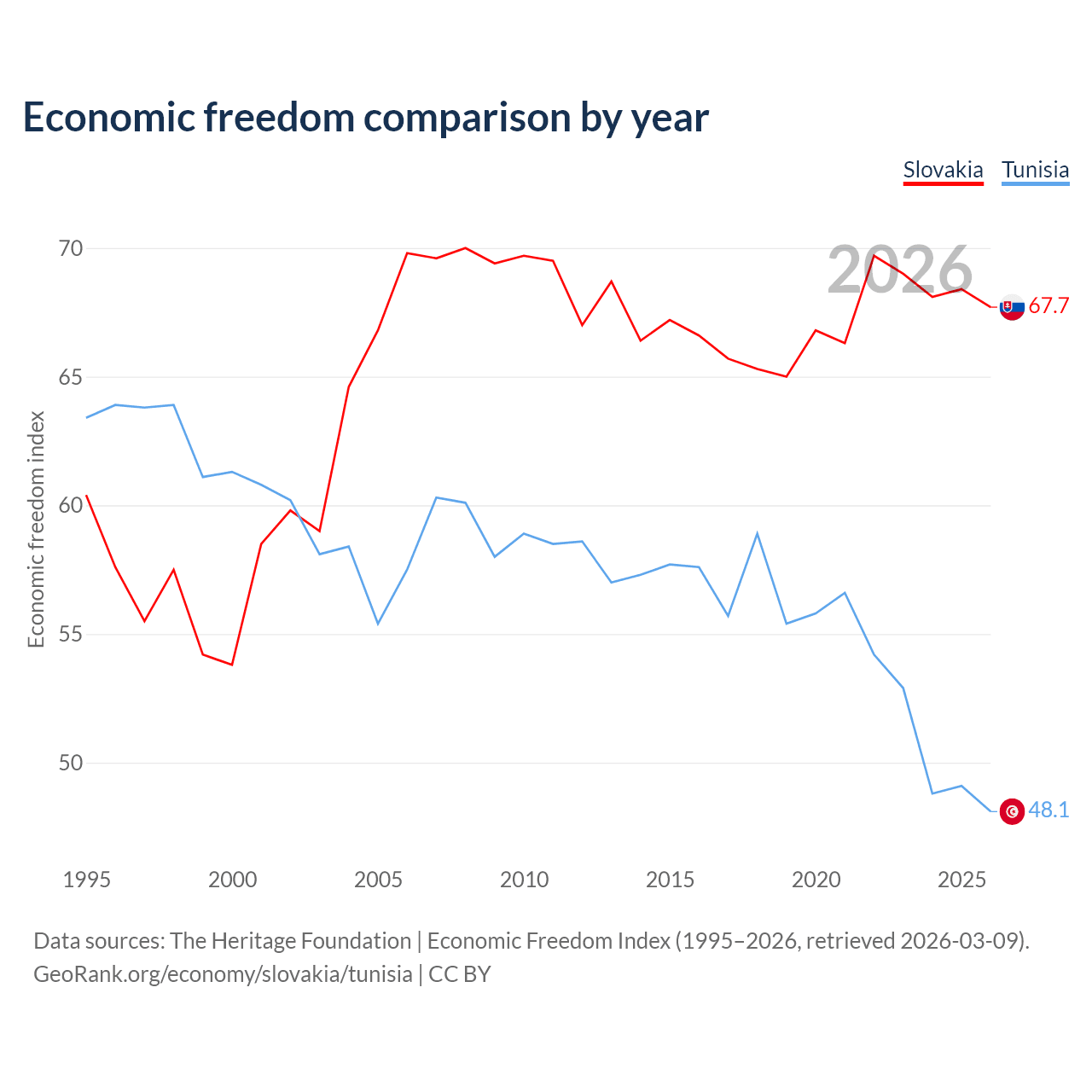 The Economic Freedom Index for Slovakia is 67.7, ranking 54/197, compared to 48.1 for Tunisia, ranking 172/197. The chart above displays a comparison of annual changes in economic freedom indexes.