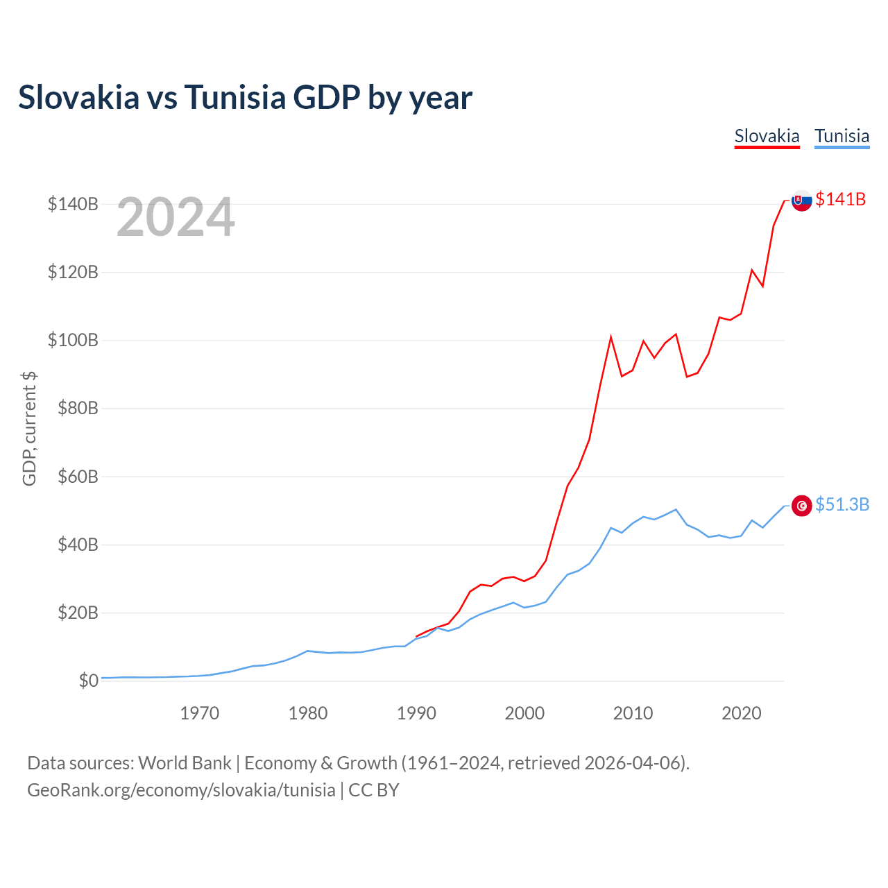 Slovakia has a GDP of $141B compared to $51.3B for Tunisia, ranking 61/197 and 93/197 by economy size, respectively.