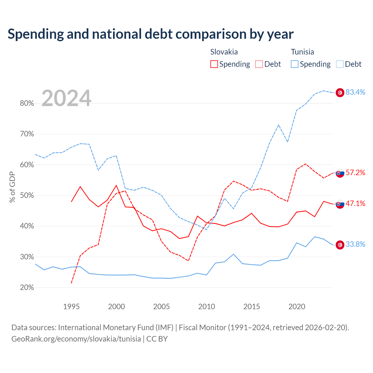 Slovakia has $80.7B in government debt (57.2% of GDP), compared to $42.8B (83.4% of GDP) in Tunisia.