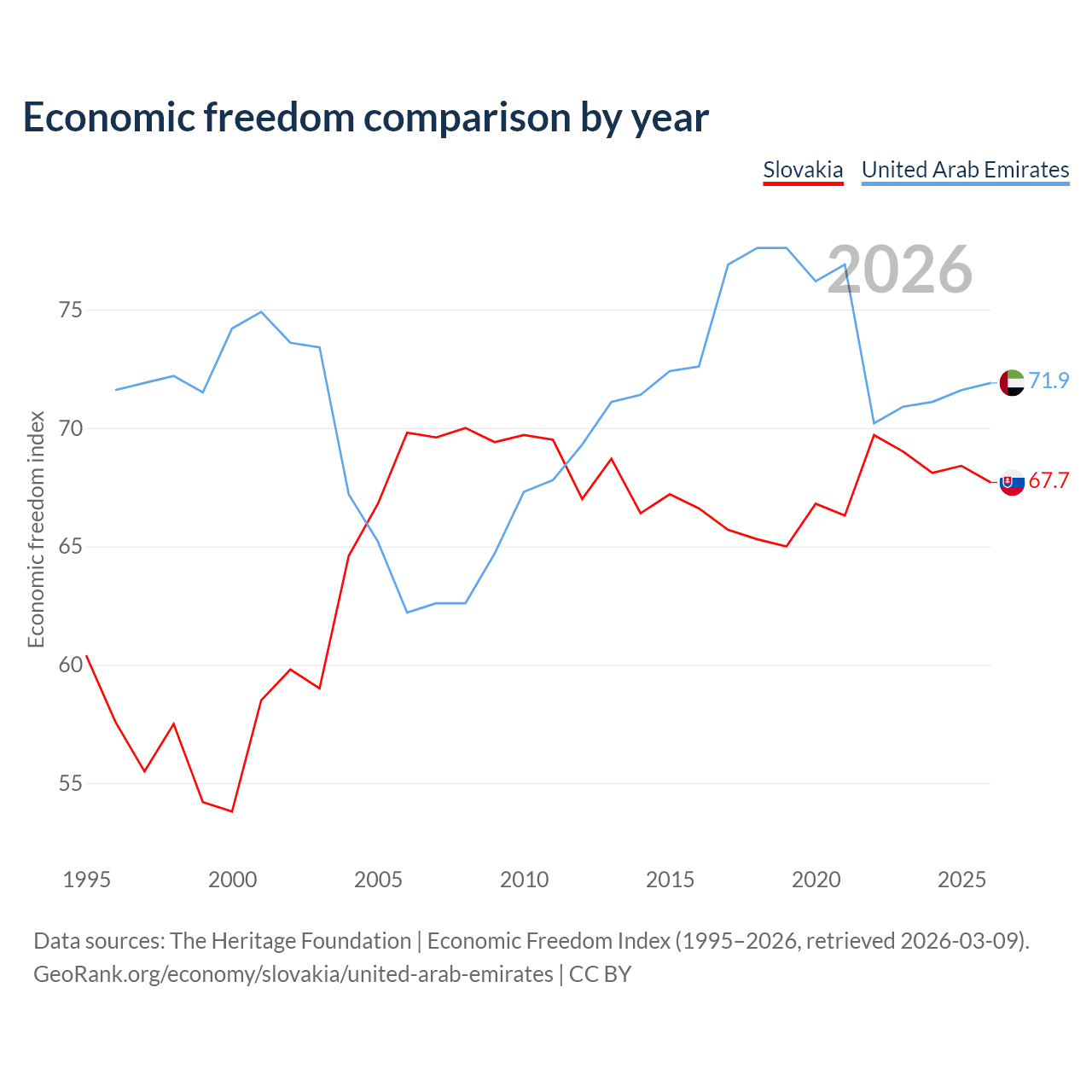 The Economic Freedom Index for Slovakia is 67.7, ranking 54/197, compared to 71.9 for the United Arab Emirates, ranking 29/197. The chart above displays a comparison of annual changes in economic freedom indexes.