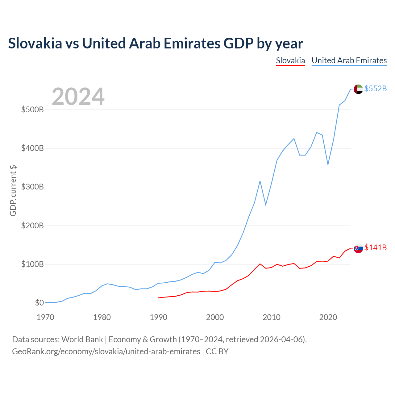 Slovakia has a GDP of $141B compared to $552B for the United Arab Emirates, ranking 61/197 and 27/197 by economy size, respectively.