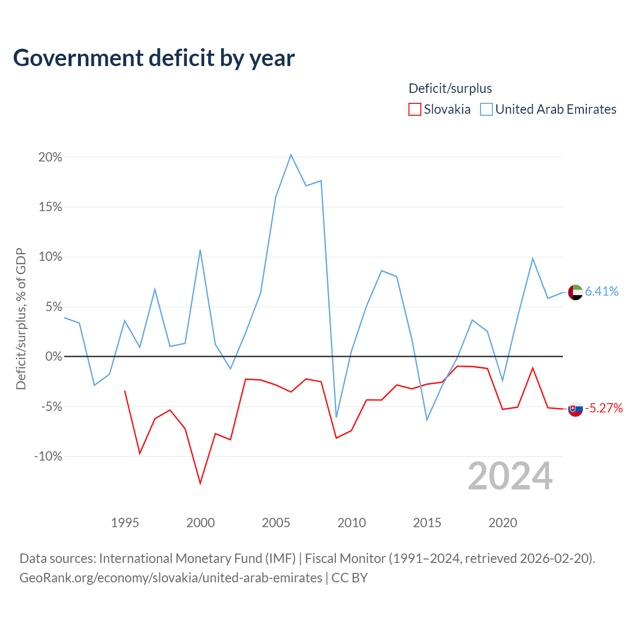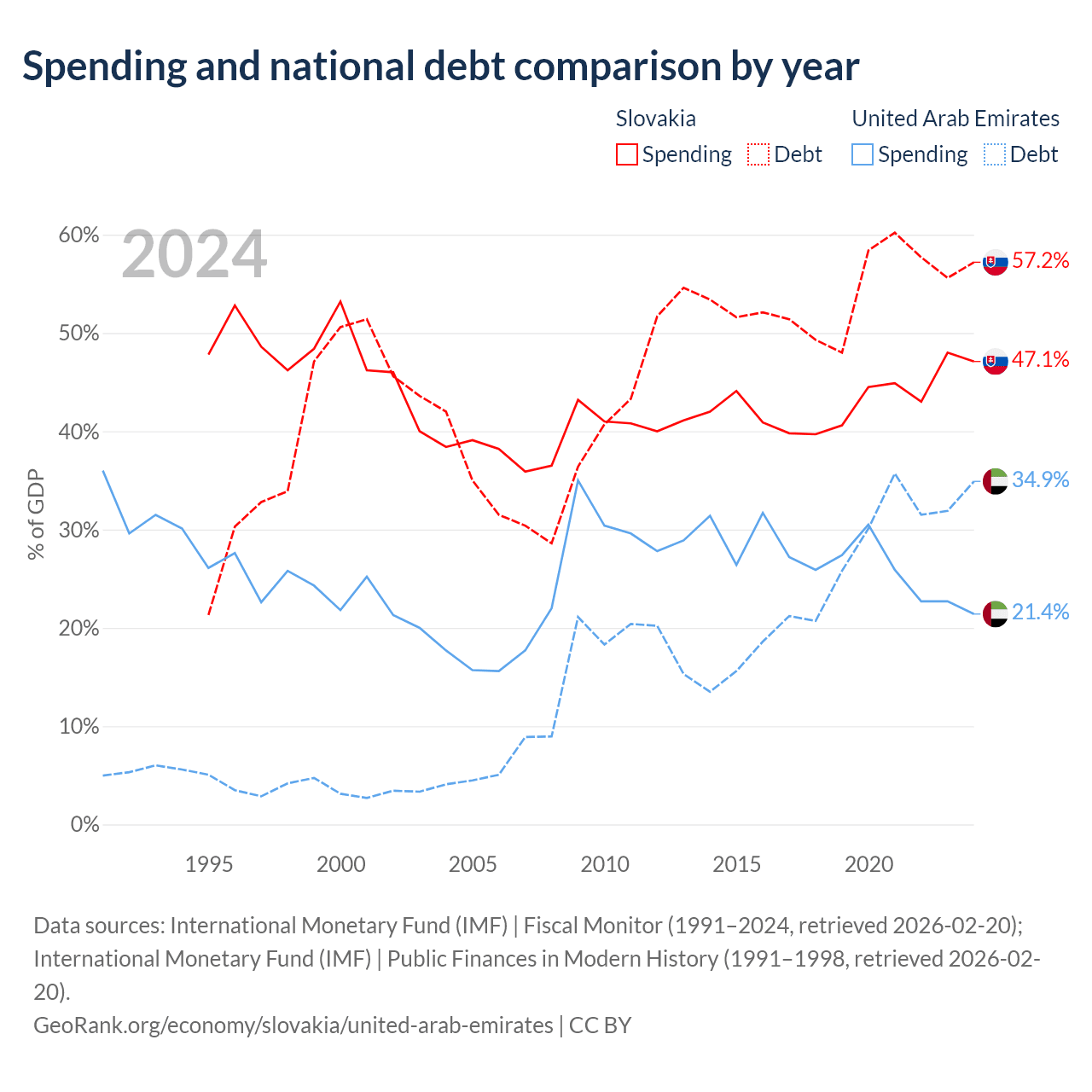 Slovakia has $80.7B in government debt (57.2% of GDP), compared to $193B (34.9% of GDP) in the United Arab Emirates.