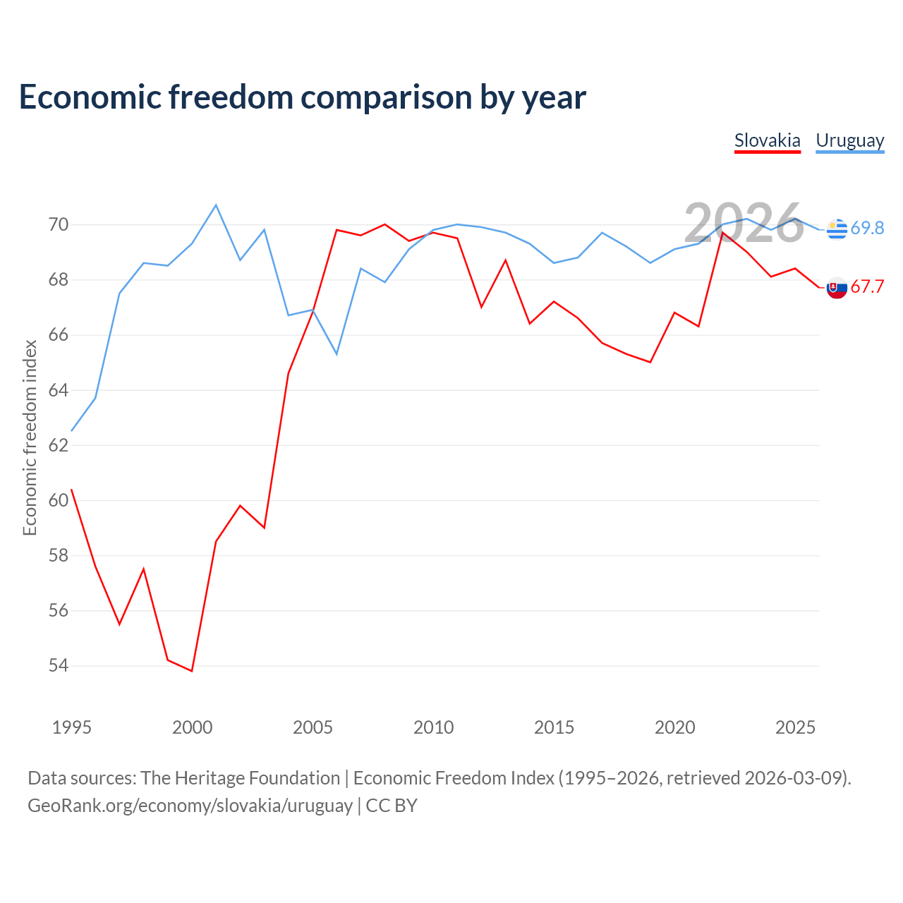 The Economic Freedom Index for Slovakia is 67.7, ranking 54/197, compared to 69.8 for Uruguay, ranking 39/197. The chart above displays a comparison of annual changes in economic freedom indexes.