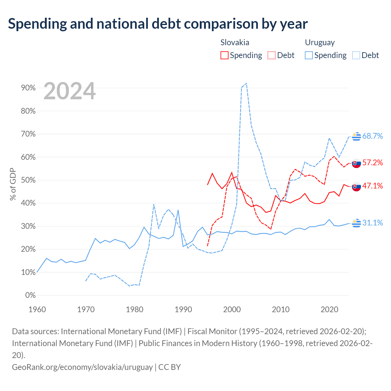 Slovakia has $80.7B in government debt (57.2% of GDP), compared to $55.6B (68.7% of GDP) in Uruguay.