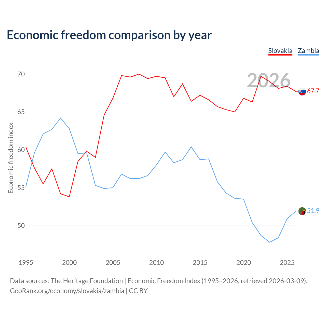 The Economic Freedom Index for Slovakia is 67.7, ranking 54/197, compared to 51.9 for Zambia, ranking 152/197. The chart above displays a comparison of annual changes in economic freedom indexes.