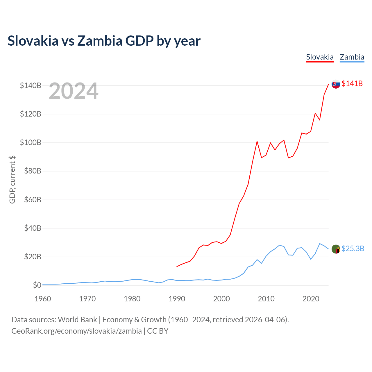 Slovakia has a GDP of $141B compared to $25.3B for Zambia, ranking 61/197 and 116/197 by economy size, respectively.