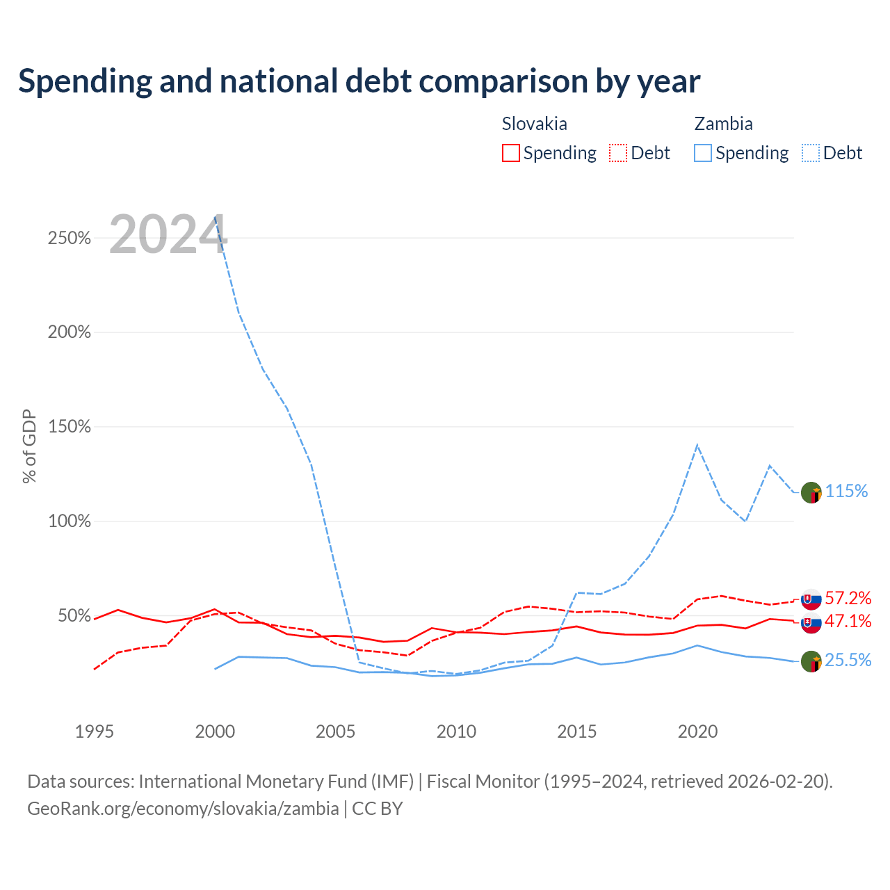 Slovakia has $80.7B in government debt (57.2% of GDP), compared to $29.1B (114.9% of GDP) in Zambia.