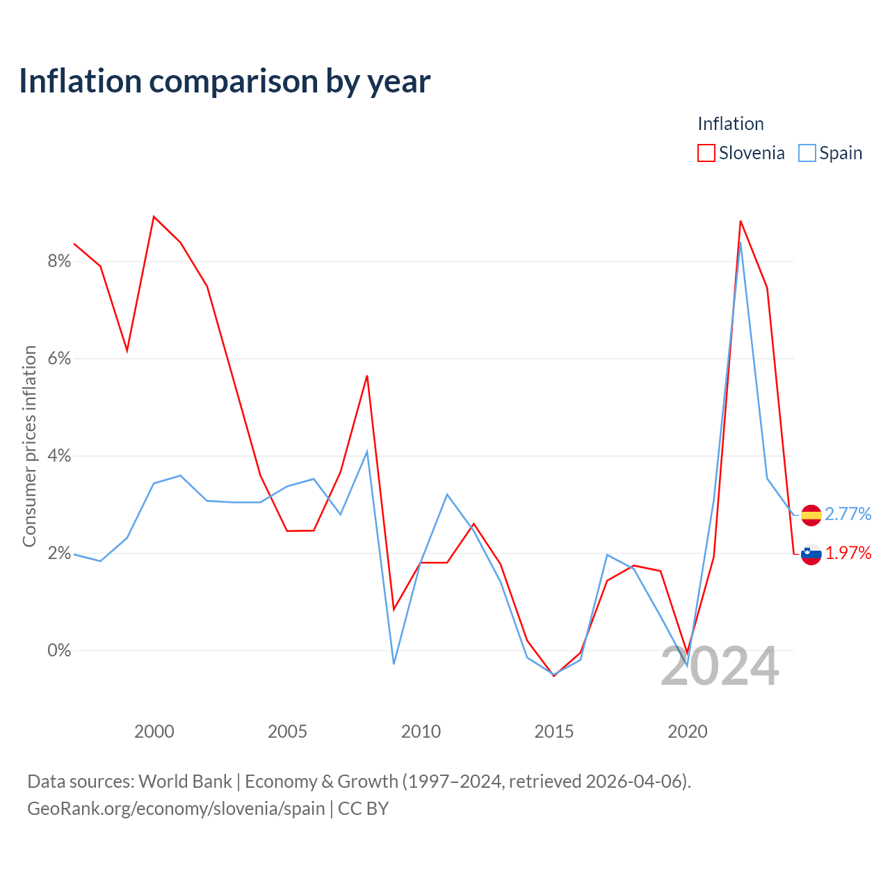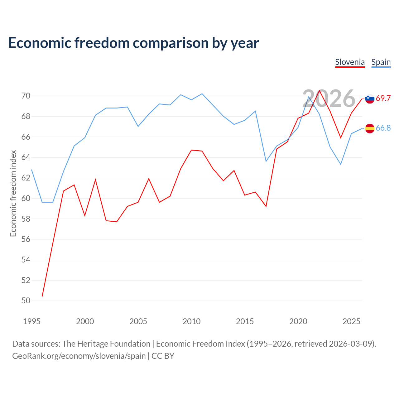The Economic Freedom Index for Slovenia is 69.7, ranking 40/197, compared to 66.8 for Spain, ranking 59/197. The chart above displays a comparison of annual changes in economic freedom indexes.