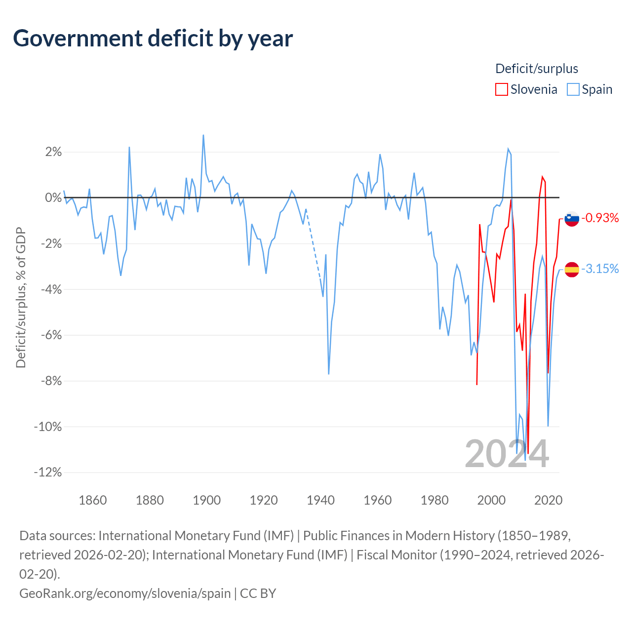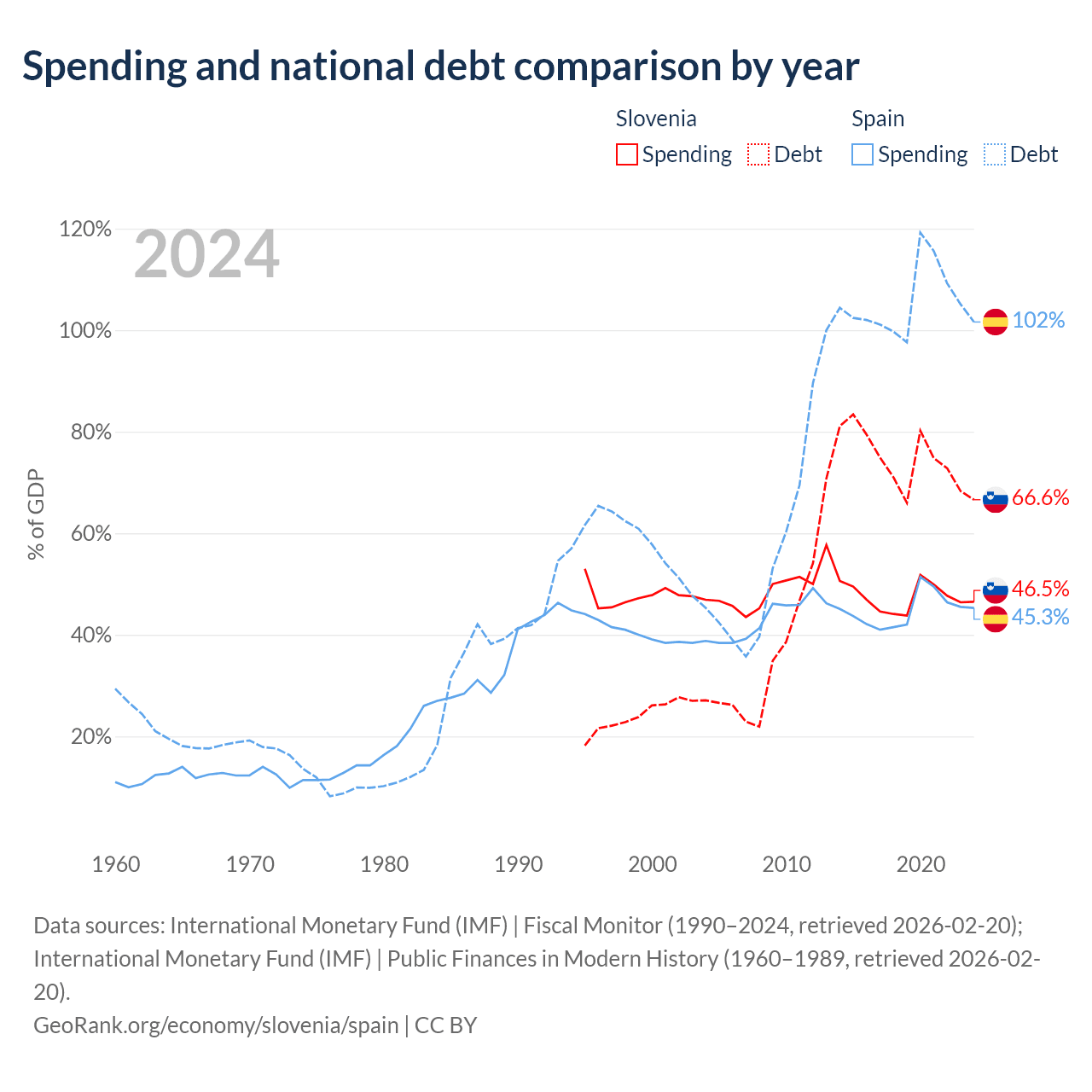 Slovenia has $48.6B in government debt (66.6% of GDP), compared to $1.75T (101.6% of GDP) in Spain.