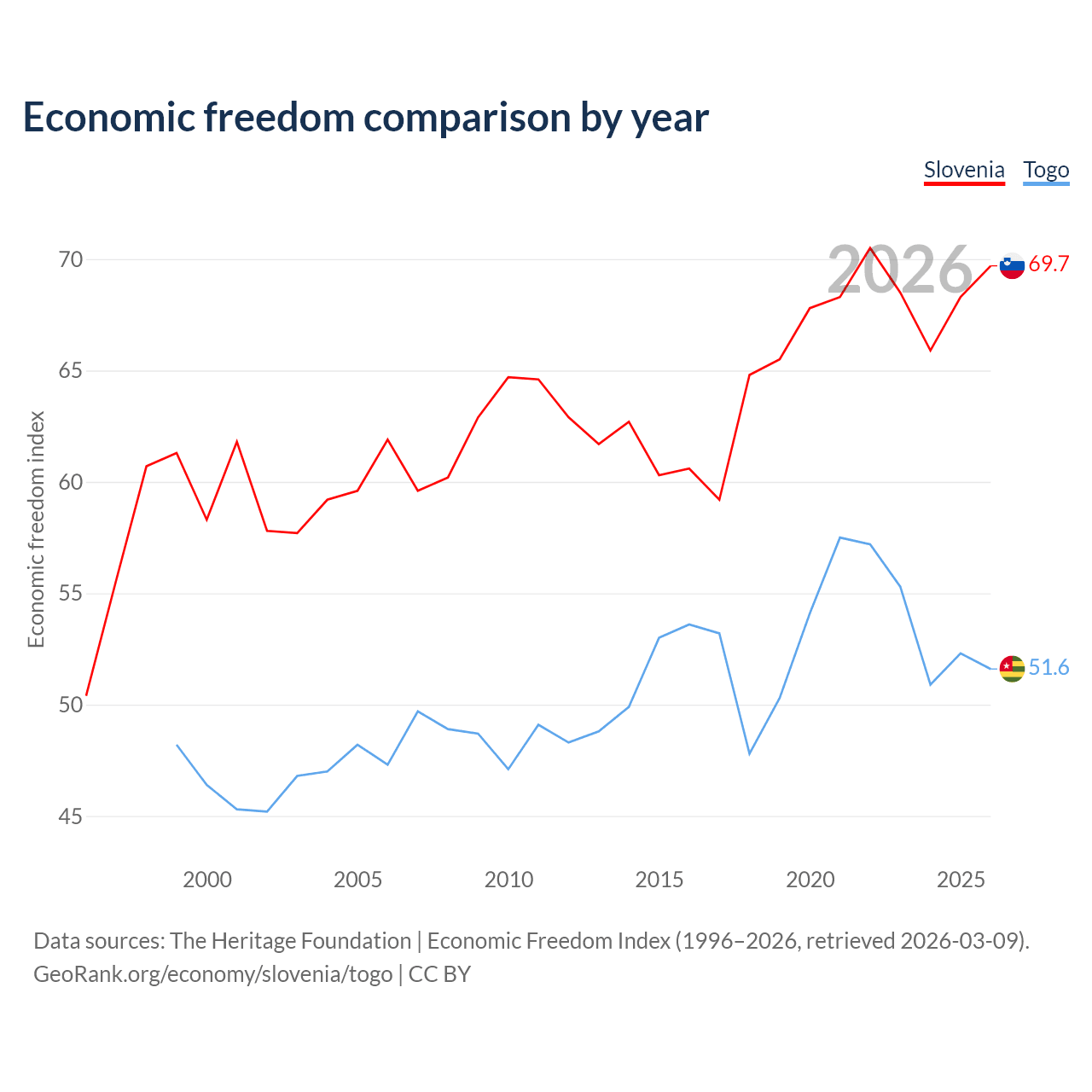 The Economic Freedom Index for Slovenia is 69.7, ranking 40/197, compared to 51.6 for Togo, ranking 153/197. The chart above displays a comparison of annual changes in economic freedom indexes.