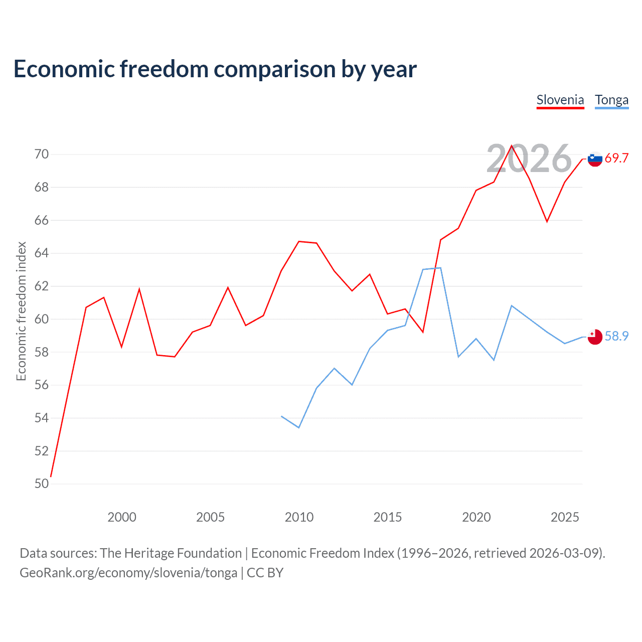 The Economic Freedom Index for Slovenia is 69.7, ranking 40/197, compared to 58.9 for Tonga, ranking 107/197. The chart above displays a comparison of annual changes in economic freedom indexes.