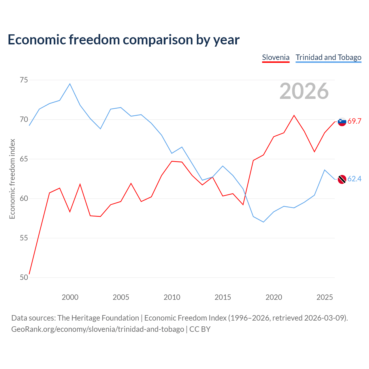 The Economic Freedom Index for Slovenia is 69.7, ranking 40/197, compared to 62.4 for Trinidad and Tobago, ranking 87/197. The chart above displays a comparison of annual changes in economic freedom indexes.