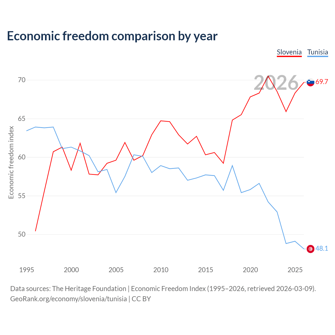 The Economic Freedom Index for Slovenia is 69.7, ranking 40/197, compared to 48.1 for Tunisia, ranking 172/197. The chart above displays a comparison of annual changes in economic freedom indexes.