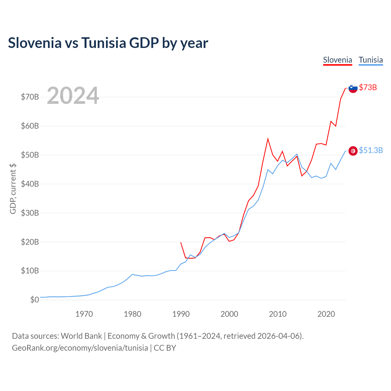Slovenia has a GDP of $73B compared to $51.3B for Tunisia, ranking 86/197 and 93/197 by economy size, respectively.